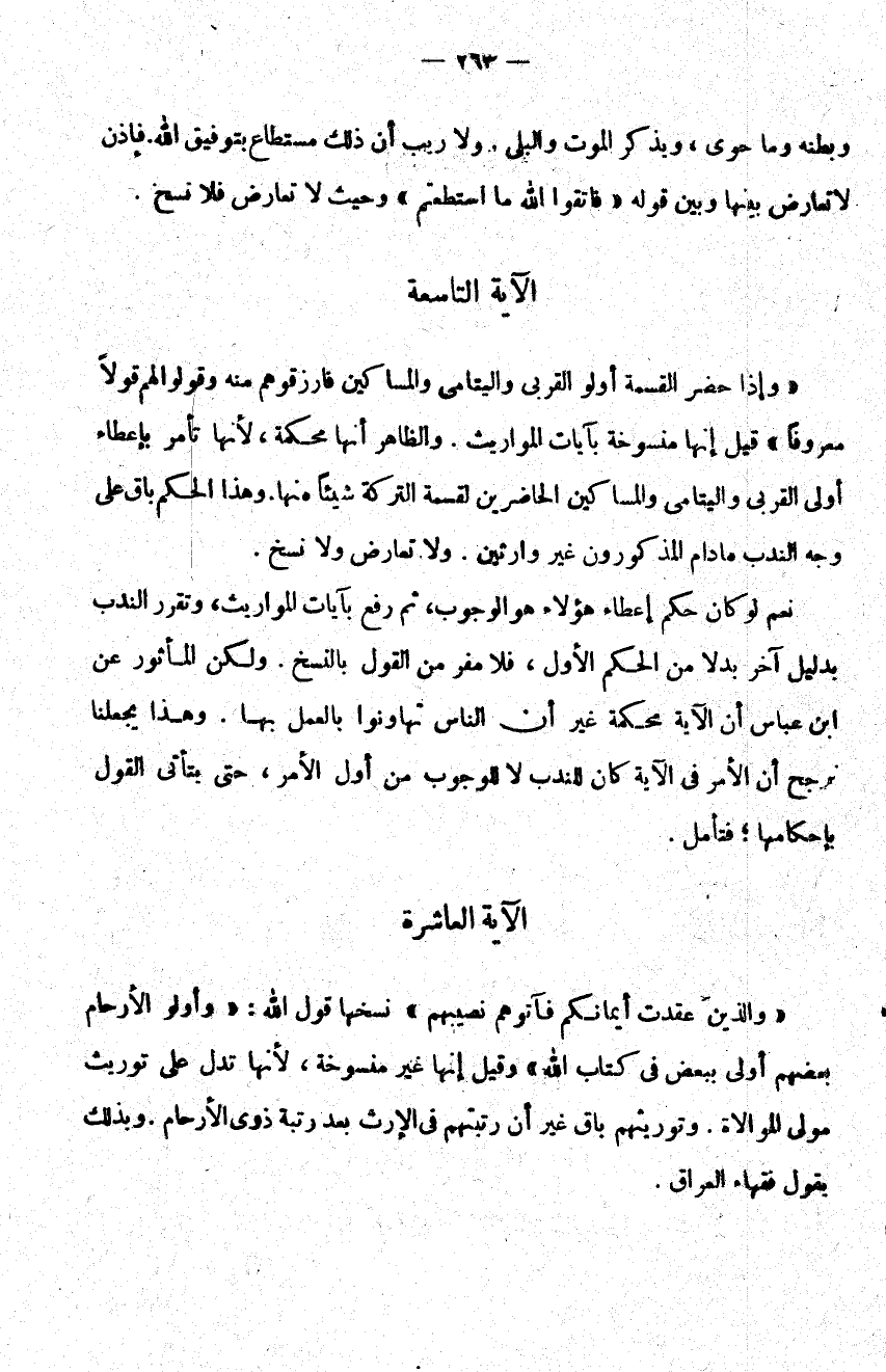 {وَإِذَا حَضَرَ الْقِسْمَةَ أُولُو الْقُرْبَى وَالْيَتَامَى وَالْمَسَاكِينُ فَارْزُقُوهُمْ مِنْهُ وَقُولُوا لَهُمْ قَوْلاً مَعْرُوفاً} قيل إنها منسوخة بآيات المواريث والظاهر أنها محكمة لأنها تأمر بإعطاء أولي القربى والمساكين الحاضرين لقسمة التركة شيئا منها وهذا الحكم باق على وجه الندب ما دام المذكورون غير وارثين ولا تعارض ولا نسخ.