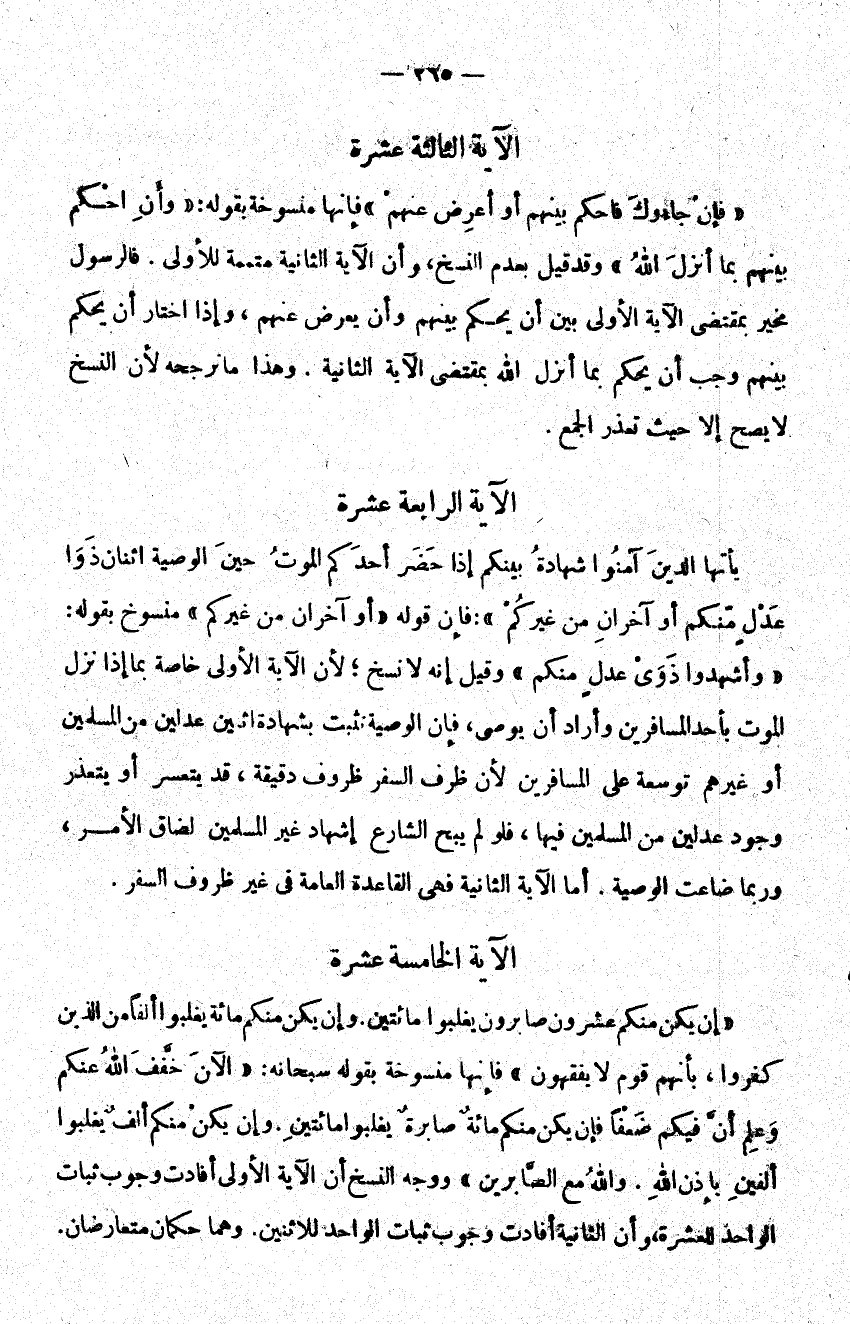 {إِنْ يَكُنْ مِنْكُمْ عِشْرُونَ صَابِرُونَ يَغْلِبُوا مِائَتَيْنِ وَإِنْ يَكُنْ مِنْكُمْ مِائَةٌ يَغْلِبُوا أَلْفاً مِنَ الَّذِينَ كَفَرُوا بِأَنَّهُمْ قَوْمٌ لا يَفْقَهُونَ} منسوخة بقوله سبحانه: {الْآنَ خَفَّفَ اللَّهُ عَنْكُمْ وَعَلِمَ أَنَّ فِيكُمْ ضَعْفاً فَإِنْ يَكُنْ مِنْكُمْ مِائَةٌ صَابِرَةٌ يَغْلِبُوا مِائَتَيْنِ وَإِنْ يَكُنْ مِنْكُمْ أَلْفٌ يَغْلِبُوا أَلْفَيْنِ بِإِذْنِ اللَّهِ وَاللَّهُ مَعَ الصَّابِرِينَ} ووجه النسخ أن الآية الأولى أفادت وجوب ثبات الواحد للعشرة وأن الثانية أفادت وجوب ثبات الواحد للاثنين وهما حكمان متعارضان