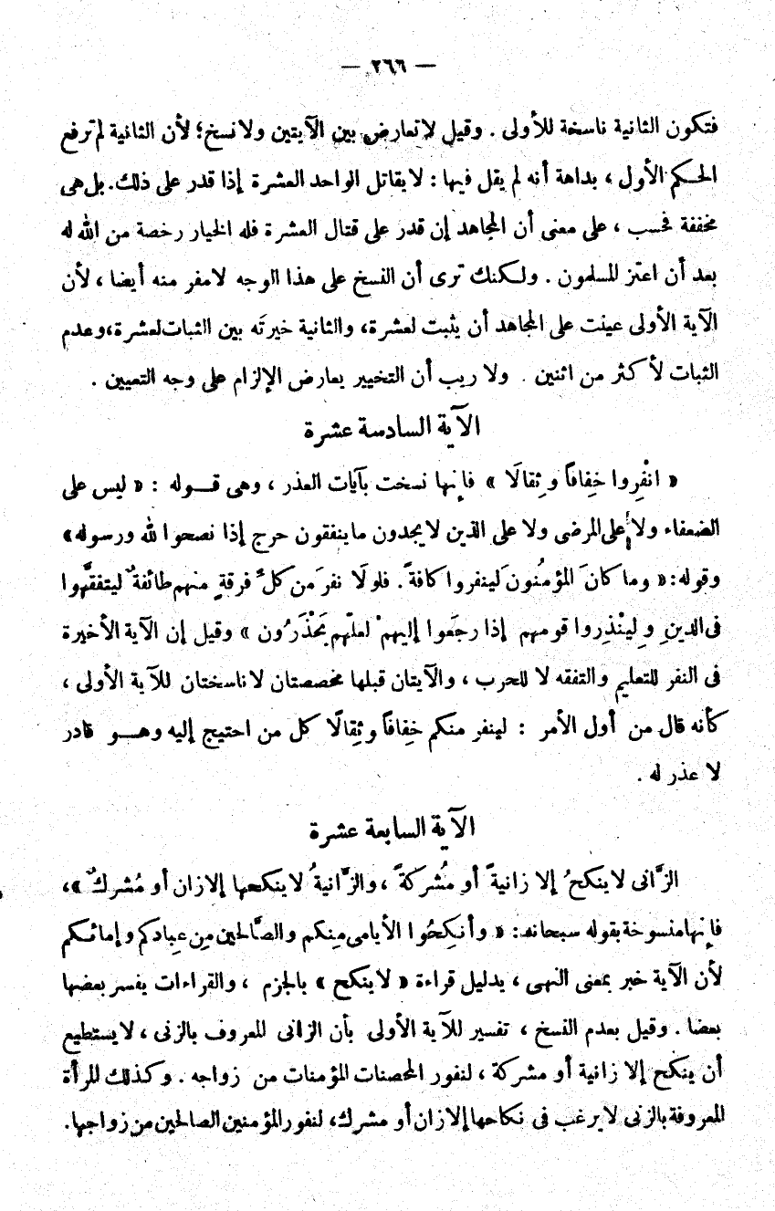 {نْفِرُوا خِفَافاً وَثِقَالاً} فإنها نسخت بآيات العذر وهي قوله: {لَيْسَ عَلَى الضُّعَفَاءِ وَلا عَلَى الْمَرْضَى وَلا عَلَى الَّذِينَ لا يَجِدُونَ مَا يُنْفِقُونَ حَرَجٌ إِذَا نَصَحُوا لِلَّهِ وَرَسُولِهِ} وقوله: {وَمَا كَانَ الْمُؤْمِنُونَ لِيَنْفِرُوا كَافَّةً فَلَوْلا نَفَرَ مِنْ كُلِّ فِرْقَةٍ مِنْهُمْ طَائِفَةٌ لِيَتَفَقَّهُوا فِي الدِّينِ وَلِيُنْذِرُوا قَوْمَهُمْ إِذَا رَجَعُوا إِلَيْهِمْ لَعَلَّهُمْ يَحْذَرُونَ} وقيل إن الآية الأخيرة في النفر للتعليم والتفقه لا للحرب والآيتان قبلها مخصصتان لا ناسختان للآية الأولى كأنه قال من أول الأمر لينفر منكم خفافا وثقالا كل من احتيج إليه وهو قادر لا عذر له.