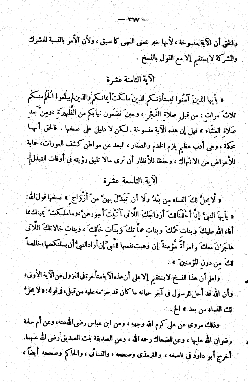 {يَا أَيُّهَا الَّذِينَ آمَنُوا لِيَسْتَأْذِنْكُمُ الَّذِينَ مَلَكَتْ أَيْمَانُكُمْ وَالَّذِينَ لَمْ يَبْلُغُوا الْحُلُمَ مِنْكُمْ ثَلاثَ مَرَّاتٍ مِنْ قَبْلِ صَلاةِ الْفَجْرِ وَحِينَ تَضَعُونَ ثِيَابَكُمْ مِنَ الظَّهِيرَةِ وَمِنْ بَعْدِ صَلاةِ الْعِشَاءِ} قيل إن هذه الآية منسوخة لكن لا دليل على نسخها فالحق أنها محكمة وهي أدب عظيم يلزم الخدم والصغار البعد عن مواطن كشف العورات حماية للأعراض من الانتهاك وحفظا للأنظار أن ترى ما لا تليق رؤيته في أوقات التبذل.