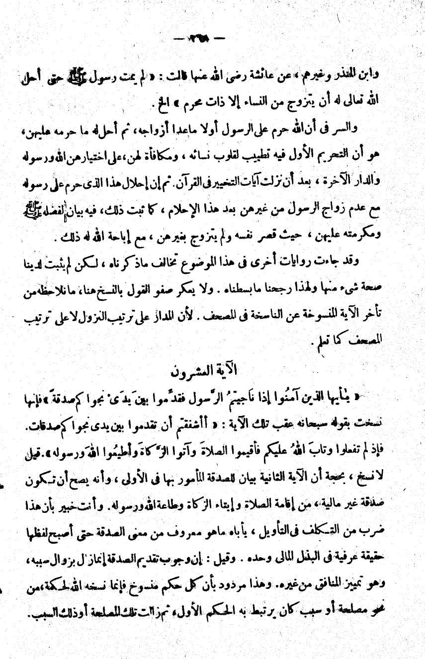 {يَا أَيُّهَا الَّذِينَ آمَنُوا إِذَا نَاجَيْتُمُ الرَّسُولَ فَقَدِّمُوا بَيْنَ يَدَيْ نَجْوَاكُمْ صَدَقَةً} ذلك خير فإنها نسخت بقوله سبحانه: عقب تلك الآية: {أَأَشْفَقْتُمْ أَنْ تُقَدِّمُوا بَيْنَ يَدَيْ نَجْوَاكُمْ صَدَقَاتٍ فَإِذْ لَمْ تَفْعَلُوا وَتَابَ اللَّهُ عَلَيْكُمْ فَأَقِيمُوا الصَّلاةَ وَآتُوا الزَّكَاةَ وَأَطِيعُوا اللَّهَ وَرَسُولَهُ} قيل لا نسخ بحجة أن الآية الثانية بيان للصدقة المأمور بها في الأولى وأنه يصح أن تكون صدقة غير مالية من إقامة الصلاة وإيتاء الزكاة وطاعة الله ورسوله وأنت خبير بأن هذا ضرب من التكلف في التأويل يأباه ما هو معروف من معنى الصدقة حتى أصبح لفظها حقيقة عرفية في البذل المالي وحده وقيل إن وجوب تقديم الصدقة إنما زال بزوال سببه وهو تمييز المنافق من غيره وهذا مردود بأن كل حكم منسوخ فإنما نسخه الله لحكمة من نحو مصلحة أو سبب كان يرتبط به الحكم الأول ثم زالت تلك المصلحة أو ذلك السبب.