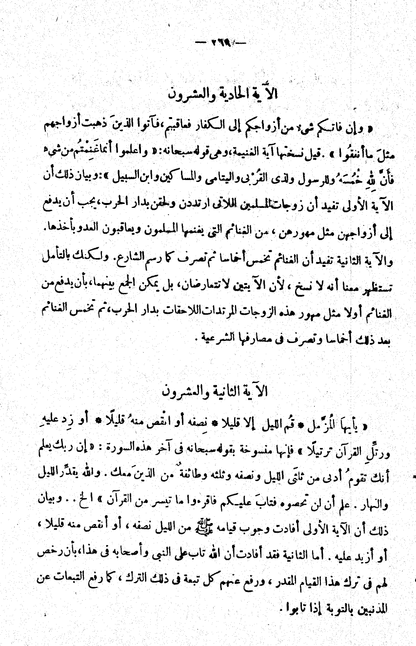 {يَا أَيُّهَا الْمُزَّمِّلُ قُمِ اللَّيْلَ إِلَّا قَلِيلاً نِصْفَهُ أَوِ انْقُصْ مِنْهُ قَلِيلاً أَوْ زِدْ عَلَيْهِ وَرَتِّلِ الْقُرْآنَ تَرْتِيلاً} فإنها منسوخة بقوله سبحانه في آخر هذه السورة: {اللَّيْلِ وَنِصْفَهُ وَثُلُثَهُ وَطَائِفَةٌ مِنَ الَّذِينَ مَعَكَ وَاللَّهُ يُقَدِّرُ اللَّيْلَ وَالنَّهَارَ عَلِمَ أَنْ لَنْ تُحْصُوهُ فَتَابَ عَلَيْكُمْ فَاقْرَأُوا مَا تَيَسَّرَ مِنَ الْقُرْآنِ} الخ وبيان ذلك أن الآية الأولى أفادت وجوب قيامه من الليل نصفه أو أنقص منه قليلا أو أزيد عليه أما الثانية فقد أفادت أن الله تاب على النبي وأصحابه في هذا بأن رخص لهم في ترك هذا القيام المقدر ورفع عنهم كل تبعة في ذلك الترك كما رفع التبعات عن المذنبين بالتوبة إذا تابوا.