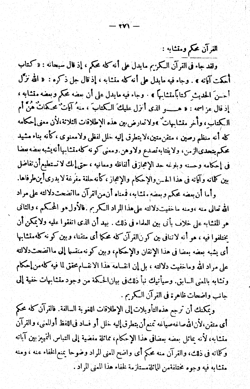 ولقد جاء في القرآن الكريم ما يدل على أنه كله محكم إذ قال سبحانه: {كِتَابٌ أُحْكِمَتْ آيَاتُهُ} وجاء فيه ما يدل على أنه كله متشابه إذ قال جل ذكره: {اللَّهُ نَزَّلَ أَحْسَنَ الْحَدِيثِ كِتَاباً مُتَشَابِهاً} وجاء فيه ما يدل على أن بعضه محكم وبعضه متشابه إذ قال عز اسمه: {هُوَ الَّذِي أَنْزَلَ عَلَيْكَ الْكِتَابَ مِنْهُ آيَاتٌ مُحْكَمَاتٌ هُنَّ أُمُّ الْكِتَابِ وَأُخَرُ مُتَشَابِهَاتٌ} ولا تعارض بين هذه الإطلاقات الثلاثة لأن معنى إحكامه كله أنه منظم رصين متقن متين لا يتطرق إليه خلل لفظي ولا معنوي كأنه بناء مشيد محكم يتحدى الزمن ولا ينتابه تصدع ولا وهن ومعنى كونه كله متشابها أنه يشبه بعضه بعضا في إحكامه وحسنه وبلوغه حد الإعجاز في ألفاظه ومعانيه حتى أنك لا تستطيع أن تفاضل بين كلماته وآياته في هذا الحسن والإحكام والإعجاز كأنه حلقة مفرغة لا يدري أين طرفاها.