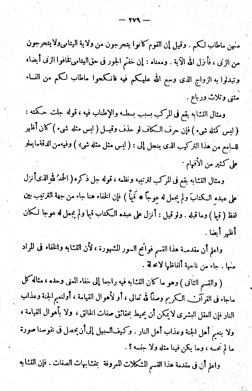 والقسم الثاني هو ما كان التشابه فيه راجعا إلى خفاء المعنى وحده مثاله كل ما جاء في القرآن الكريم وصفا لله تعالى أو لأهوال القيامة أو لنعيم الجنة وعذاب النار فإن العقل البشري لا يمكن أن يحيط بحقائق صفات الخالق ولا بأهوال القيامة ولا بنعيم أهل الجنة وعذاب أهل النار وكيف السبيل إلى أن يحصل في نفوسنا صورة ما لم نحسه وما يكن فينا مثله ولا جنسه؟.