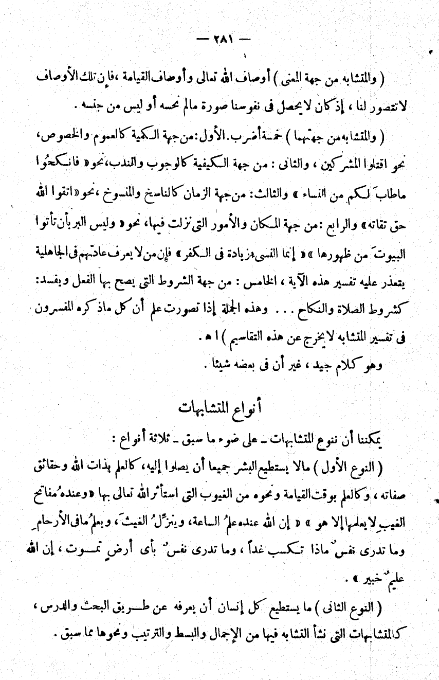 والمتشابه من جهتهما خمسة أضرب الأول من جهة الكمية كالعموم والخصوص نحو اقتلوا المشركين والثاني من جهة الكيفية كالوجوب والندب نحو فانكحوا ما طاب لكم من النساء والثالث من جهة الزمان كالناسخ والمنسوخ نحو اتقوا الله حق تقاته والرابع من جهة المكان والأمور التي نزلت فيها نحو {وَلَيْسَ الْبِرُّ بِأَنْ تَأْتُوا الْبُيُوتَ مِنْ ظُهُورِهَا} {إِنَّمَا النَّسِيءُ زِيَادَةٌ فِي الْكُفْرِ} فإن من لا يعرف عادتهم في الجاهلية يتعذر عليه تفسير هذه الآية الخامس من جهة الشروط التي يصح بها الفعل ويفسد كشروط الصلاة والنكاح وهذه الجملة إذا تصورت علم أن كل ما ذكره المفسرون في تفسير المتشابه لا يخرج عن هذه التقاسيم اهـ.