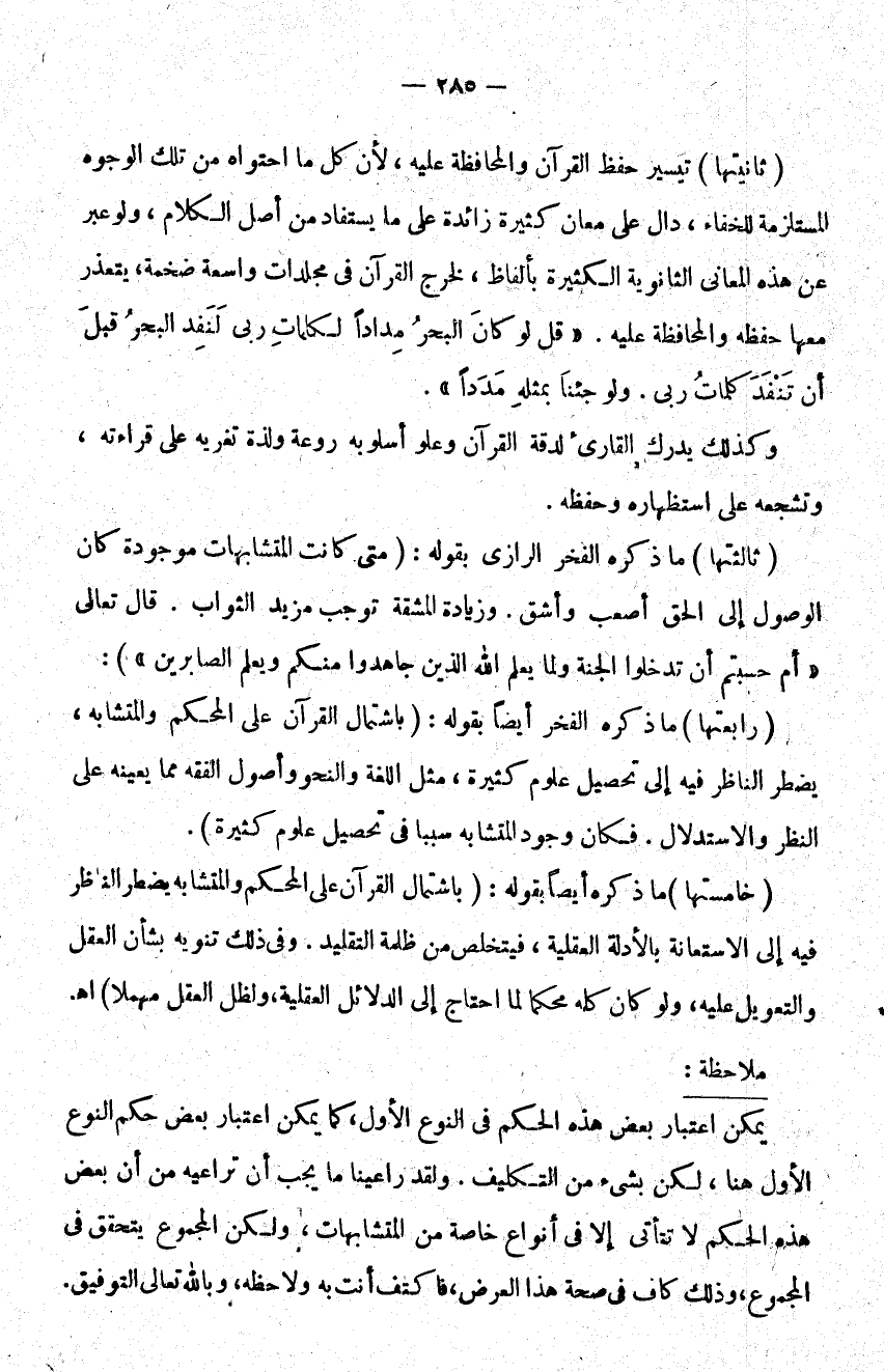 ثانيتها تيسير حفظ القرآن والمحافظة عليه لأن كل ما احتواه من تلك الوجوه المستلزمة للخفاء دال على معان كثيرة زائدة على ما يستفاد من أصل الكلام ولو عبر عن هذه المعاني الثانوية الكثيرة بألفاظ لخرج القرآن في مجلدات واسعة ضخمة يتعذر معها حفظه والمحافظة عليه: {قُلْ لَوْ كَانَ الْبَحْرُ مِدَاداً لِكَلِمَاتِ رَبِّي لَنَفِدَ الْبَحْرُ قَبْلَ أَنْ تَنْفَدَ كَلِمَاتُ رَبِّي وَلَوْ جِئْنَا بِمِثْلِهِ مَدَداً} .