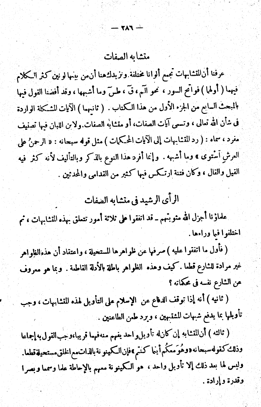 ثانيه أنه إذا توقف الدفاع عن الإسلام على التأويل لهذه المتشابهات وجب تأويلها بما يدفع شبهات المشتبهين ويدر طعن الطاعنين.