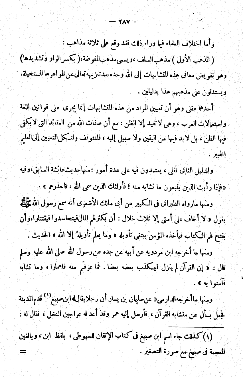 المذهب الأول مذهب السلف ويسمى مذهب المفوضة بكسر الواو وتشديدها وهو تفويض معاني هذه المتشابهات إلى الله وحده بعد تنزيهه تعالى عن ظواهرها المستحيلة ويستدلون على مذهبهم هذا بدليلين.