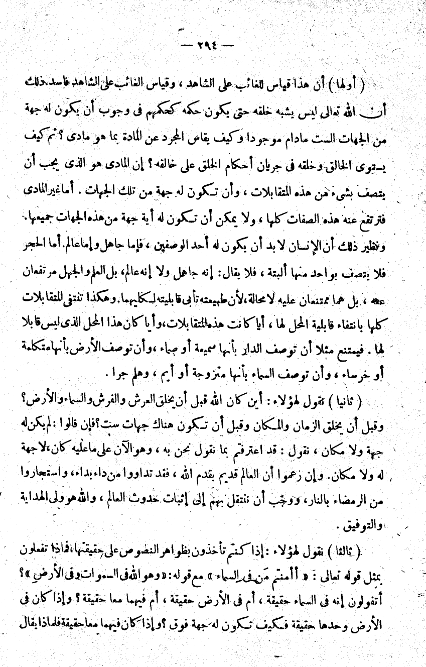 أولها أن هذا قياس للغائب على الشاهد وقياس الغائب على الشاهد فاسد ذلك أن الله تعالى ليس يشبه خلقه حتى يكون حكمه كحكمهم في وجوب أن يكون له جهة من الجهات الست ما دام موجودا وكيف يقاس المجرد عن المادة بما هو مادي ثم كيف يستوي الخلق وخلقه في جريان أحكام الخلق على خالقه إن المادي هو الذي يجب أن يتصف بشيء من هذه المتقابلات وأن تكون له جهة من تلك الجهات أما عين المادي فترتفع عنه هذه الصفات كلها ولا يمكن أن تكون له أية جهة من هذه الجهات جميعها ونظير ذلك أن الإنسان لا بد أن يكون له أحد الوصفين فإما جاهل وإما عالم أما الحجر فلا يتصف بواحد منها ألبتة فلا يقال إنه جاهل ولا إنه عالم بل العلم والجهل مرتفعان عنه بل هما ممتنعان عليه لا محالة لأن طبيعته تأبى قابليته لكليهما وهكذا تنتفي المتقابلات كلها بانتفاء قابلية المحل لها أيا كانت هذه المتقابلات وأيا كان هذا المحل الذي ليس قابلا لها فيمتنع مثلا أن توصف الدار بأنها سمعية أو صماء وأن توصف الأرض بأنها متكلمة أو خرساء وأن توصف السماء بأنها متزوجة أو أيم وهلم جرا.