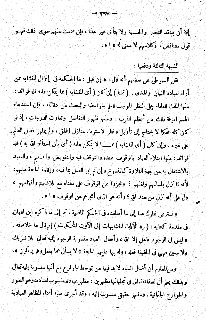 نقل السيوطي عن بعضهم أنه قال إن قيل ما الحكمة في إنزال المتشابه ممن أراد لعباده البيان والهدى قلنا إن كان أي المتشابه مما يمكن علمه فله فوائد منها الحث للعلماء على النظر الموجب للعلم بغوامضه والبحث عن دقائقه فإن استدعاء الهمم لمعرفة ذلك من أعظم القرب ومنها ظهور التفاضل وتفاوت الدرجات إذ لو كان كله محكما لا يحتاج إلى تأويل ونظر لاستوت منازل الخلق ولم يظهر فضل العالم على غيره وإن كان أي المتشابه مما لا يمكن علمه أي بأن استأثر الله به فله فوائد منها ابتلاء العباد بالوقوف عنده والتوقف فيه والتفويض والتسليم والتعبد بالاشتغال به من جهة التلاوة كالمنسوخ وإن لم يجز العمل بما فيه وإقامة الحجة عليهم لأنه لما نزل بلسانهم ولغتهم وعجزوا عن الوقوف اهـ على معناه مع بلاغتهم وأفهامهم دل على أنه نزل من عند الله وأنه هو الذي أعجزهم عن الوقوف.