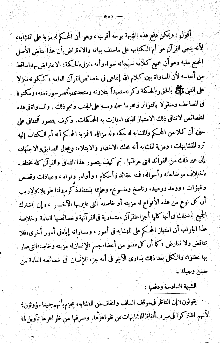 أقول: ويمكن دفع هذه الشبهة بوجه أقرب وهو أن المحكم له مزية على المتشابه لأنه بنص القرآن هو أم الكتاب على ما سلف بيانه والاعتراض بأن هذا ينقض الأصل المجمع عليه وهو أن جميع كلامه سبحانه سواء وأنه منزل بالحكمة الاعتراض بهذا ساقط من أساسه لأن المساواة بين كلام الله إنما هي في خصائص القرآن العامة ككونه منزلا على النبي صلى الله عليه وسلم بالحق وبالحكمة وكونه متعبدا بتلاوته ومتحدي بأقصر سورة منه ومكتوبا في المصاحف ومنقولا بالتواتر ومحرما حمله ومسه على الجنب ونحو ذلك والمساواة في هذه الخصائص لا تنافي ذلك الامتياز الذي امتازت به المحكمات وكيف يتصور التنافي على حين أن كلا من المحكم والمتشابه له حكمه وله مزاياه فمزية المحكم أنه أم الكتاب إليه ترد المتشابهات ومزية المتشابه أنه محك الاختبار والابتلاء ومجال التسابق والاجتهاد إلى غير ذلك من الفوائد التي عرفتها ثم كيف يتصور هذا التنافي والقرآن كله مختلف باختلاف موضوعاته وأحواله فمنه عقائد وأحكام وأوامر ونواه وعبادات وقصص وتنبؤات ووعد ووعيد وناسخ ومنسوخ وهلم مما يستنفد ذكره وقتا طويلا ولا ريب أن كل نوع من هذه الأنواع له مزيته أو خاصته التي غاير بها الآخر وإن اشترك الجميع بعد ذلك في أنها كلها أجزاء للقرآن متساوية في القرآنية وخصائصها العامة وخلاصة هذا الجواب أن اميتاز المحكم على المتشابه في أمور ومساواته إياه في أمور أخرى فلا تناقض ولا تعارض كما أن كل عضو من أعضاء جسم الإنسان له مزيته وخاصته التي صار بها عضوا والكل بعد ذلك يساوي الآخر في أنه جزء للإنسان في خصائصه العامة من حسن وحياة.