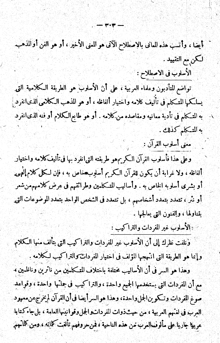 وهذا هو السر في أن الأساليب مختلفة باختلاف المتكلمين من ناثرين وناظمين مع أن المفردات التي يستخدمها الجميع واحدة والتراكيب في جملتها واحدة وقواعد صوغ المفردات وتكوين الجمل واحدة وهذا هو السر أيضا في أن القرآن لم يخرج عن معهود العرب في لغتهم العربية من حيث ذوات المفردات والجمل وقوانينها العامة بل جاء كتابا عربيا جاريا على مألوف العرب من هذه الناحية فمن حروفهم تألفت كلماته ومن كلماتهم