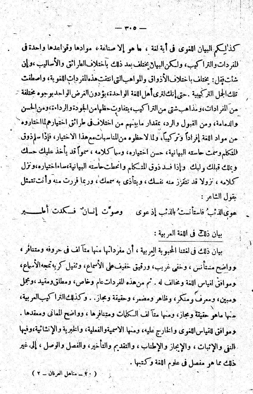 بيان ذلك في لغتنا المحبوبة العربية أن مفرداتها منها متآلف في حروفه ومتنافر وواضح مستأنس وخفي غريب ورقيق خفيف على الأسماع وثقيل كرية تمجه الأسماع وموافق لقياس اللغة ومخالف له ثم من هذه المفردات عام وخاص ومطلق ومقيد ومجمل ومبين ومعرف ومنكر وظاهر ومضمر وحقيقة ومجاز وكذلك التراكيب العربية منها ما هو حقيقة ومجاز ومنها متآلف الكلمات ومتنافرها وواضح المعاني ومعقدها وموافق للقياس اللغوي والخارج عليه ومنها الاسمية والفعلية والخبرية والإنشائية وفيها النفي والإثبات والإيجاز والإطناب والتقديم والتأخير والفصل والوصل إلى غير ذلك مما هو مفصل في علوم اللغة وكتبها.