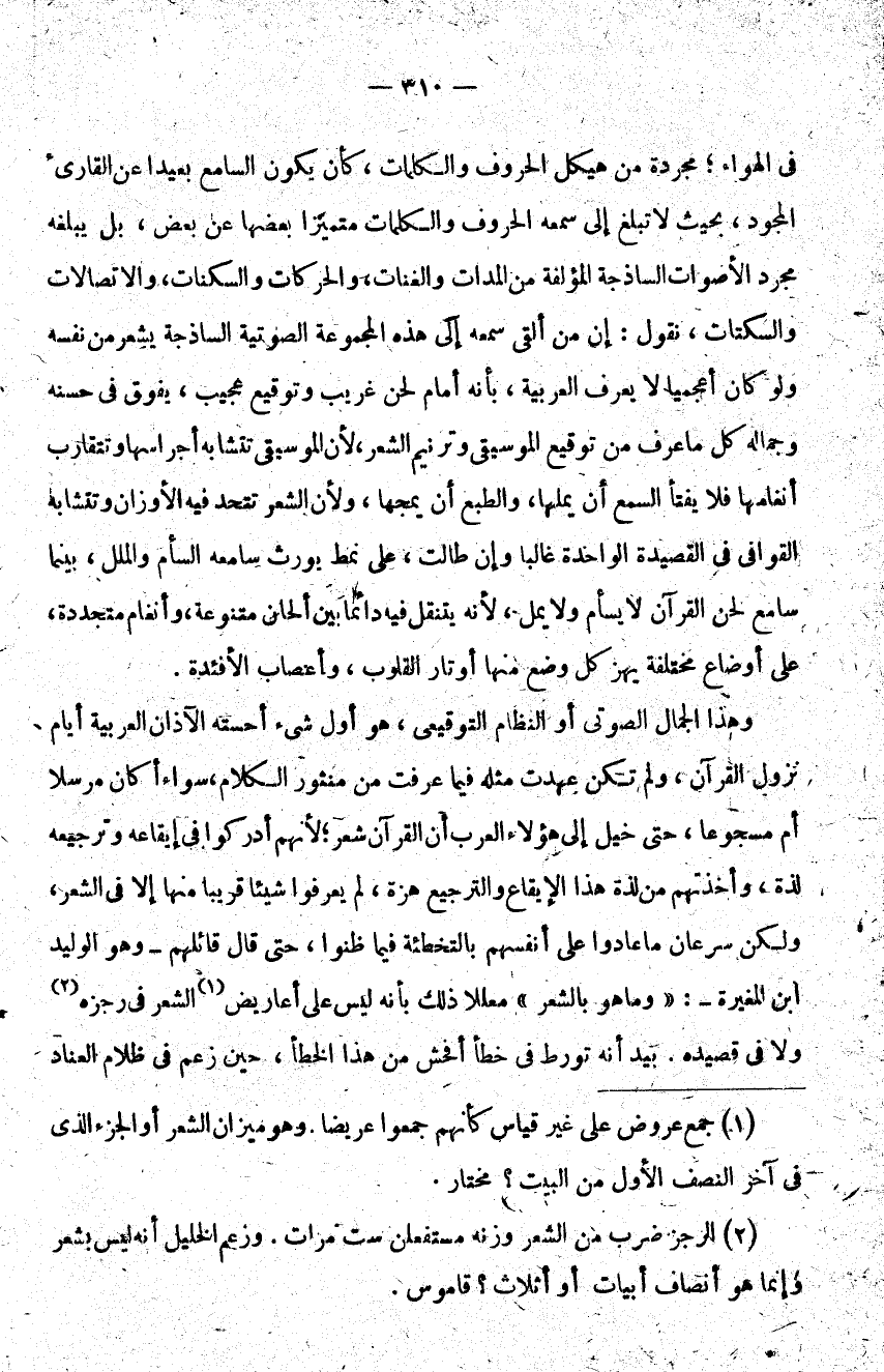 في الهواء مجردة من هيكل الحروف والكلمات كأن يكون السامع بعيدا عن القارئ المجود بحيث لا تبلغ إلى سمعه الحروف والكلمات متميزا بعضها عن بعض بل يبلغه مجرد الأصوات الساذجة المؤلفة من المدات والغنات والحركات والسكنات والاتصالات والسكتات نقول إن من ألقى سمعه إلى هذه المجموعة الصوتية الساذجة يشعر من نفسه ولو كان أعجميا لا يعرف العربية بأنه أمام لحن غريب وتوقيع عجيب يفوق في حسنه وجماله كل ما عرف من توقيع الموسيقى وترنيم الشعر لأن الموسيقى تتشابه أجراسها وتتقارب أنغامها فلا يفتأ السمع أن يملها والطبع أن يمجها ولأن الشعر تتحد فيه الأوزان وتتشابه القوافي في القصيدة الواحدة غالبا وإن طالت على نمط يورث سامعه السأم والملل بينما سامع لحن القرآن لا يسأم ولا يمل لأنه يتنقل فيه دائما بين ألحان متنوعة وأنغام متجددة على أوضاع مختلفة يهز كل وضع منها أوتار القلوب وأعصاب الأفئدة.