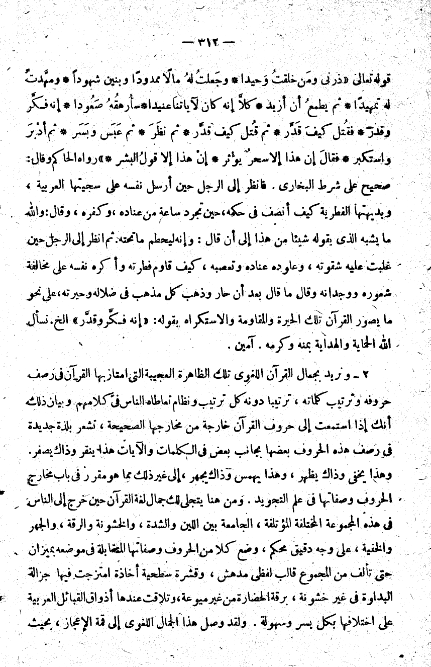 قوله تعالى: {ذَرْنِي وَمَنْ خَلَقْتُ وَحِيداً , وَجَعَلْتُ لَهُ مَالاً مَمْدُوداً , وَبَنِينَ شُهُوداً , وَمَهَّدْتُ لَهُ تَمْهِيداً , ثُمَّ يَطْمَعُ أَنْ أَزِيدَ , كَلَّا إِنَّهُ كَانَ لِآياتنَا عَنِيداً , سَأُرْهِقُهُ صَعُوداً , إِنَّهُ فَكَّرَ وَقَدَّرَ , فَقُتِلَ كَيْفَ قَدَّرَ , ثم قُتِلَ كَيْفَ قَدَّرَ , ثُمَّ نَظَرَ , ثُمَّ عَبَسَ وَبَسَرَ , ثُمَّ أَدْبَرَ وَاسْتَكْبَرَ , فَقَالَ إِنْ هَذَا إِلَّا سِحْرٌ يُؤْثَرُ , إِنْ هَذَا إِلَّا قَوْلُ الْبَشَرِ} رواه الحاكم وقال صحيح على شرط البخاري فانظر إلى الرجل حين أرسل نفسه على سجيتها العربية وبديهتها الفطرية كيف أنصف في حكمه حين تجرد ساعة من عناده وكفره وقال والله ما يشبه الذي يقوله شيئا من هذا إلى أن قال وإنه ليحطم ما تحته ثم انظر إلى الرجل حين غلبت عليه شقوته وعاوده عناده وتعصبه كيف قاوم فطرته وأكره نفسه على مخالفة شعوره ووجدانه وقال ما قال بعد أن حار وذهب كل مذهب في ضلاله وحيرته على نحو ما يصور القرآن تلك الحيرة والمقاومة والاستكراه بقوله إنه فكر وقدر الخ نسأل الله الحماية والهداية بمنه وكرمه آمين.