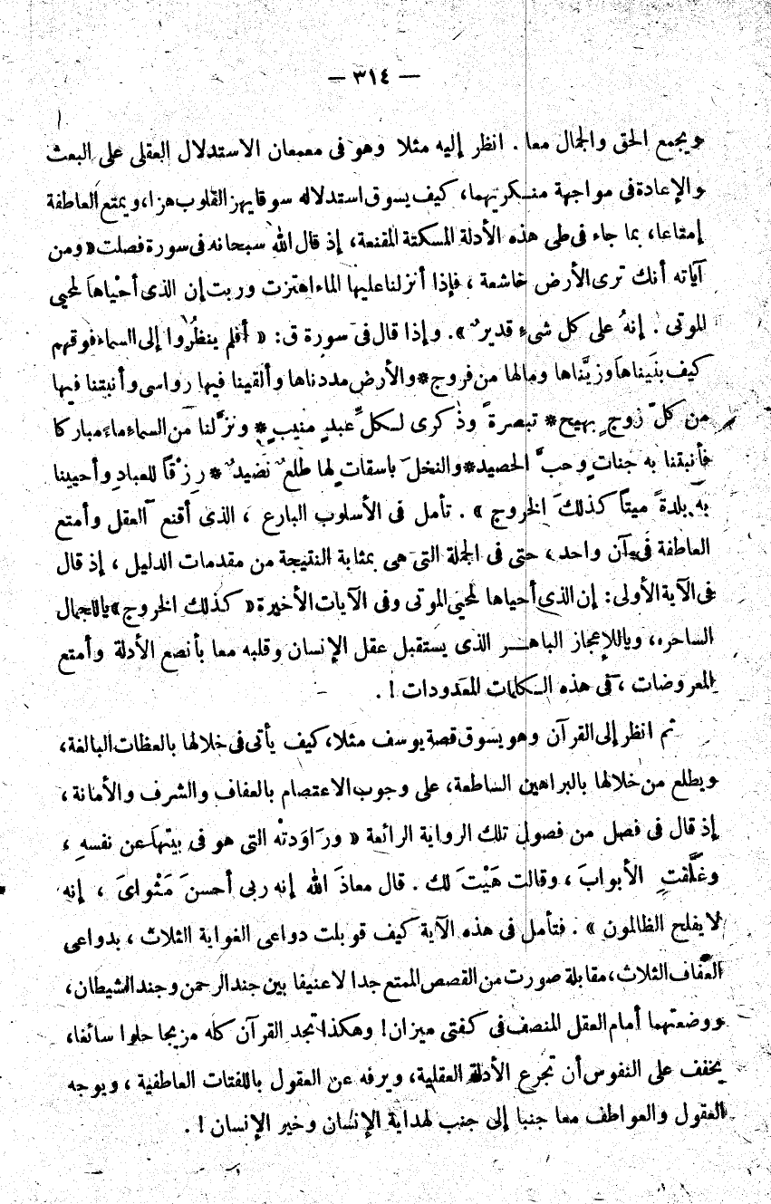 ثم انظر إلى القرآن وهو يسوق قصة يوسف مثلا كيف يأتي في خلالها بالعظات البالغة ويطلع من خلالها بالبراهين الساطعة على وجوب الاعتصام بالعفاف والشرف والأمانة إذ قال في فصل من فصول تلك الرواية الرائعة {وَرَاوَدَتْهُ الَّتِي هُوَ فِي بَيْتِهَا عَنْ نَفْسِهِ وَغَلَّقَتِ الْأَبْوَابَ وَقَالَتْ هَيْتَ لَكَ قَالَ مَعَاذَ اللَّهِ إِنَّهُ رَبِّي أَحْسَنَ مَثْوَايَ إِنَّهُ لا يُفْلِحُ الظَّالِمُونَ} فتأمل في هذه الآية كيف قوبلت دواعي الغواية الثلاث بدواعي العفاف الثلاث مقابلة صورت من القصص الممتع جدالا عنيفا بين جند الرحمن وجند الشيطان ووضعتها أمام العقل المنصف في كفتي ميزان! وهكذا تجد القرآن كله مزيجا حلوا سائغا يخفف على النفوس أن تجرع الأدلة العقلية ويرفه عن العقول باللفتات العاطفية ويوجه العقول والعواطف معا جنبا إلى جنب لهداية الإنسان وخير الإنسان!.