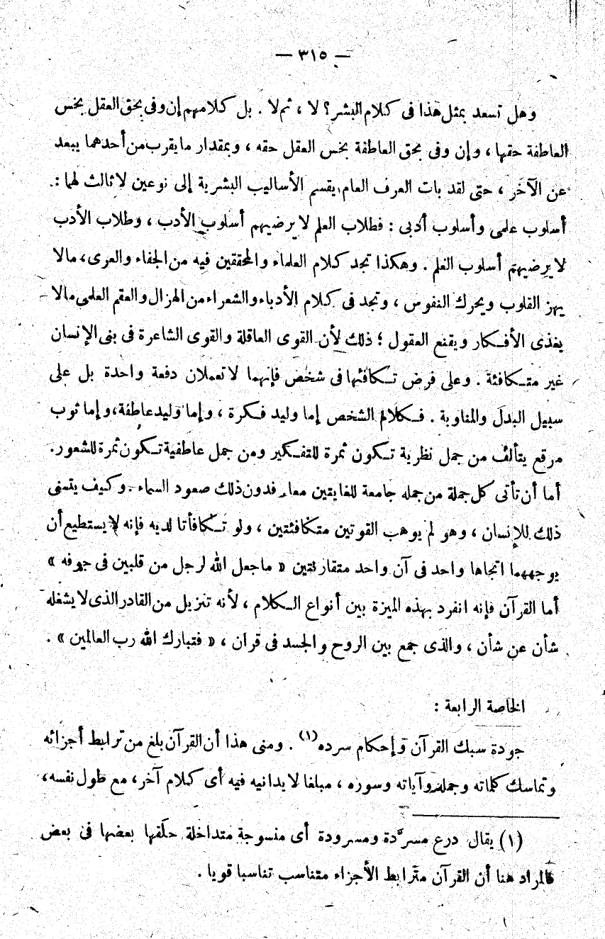 وهل تسعد بمثل هذا في كلام البشر؟ لا ثم لا بل كلامهم إن وفى بحق العقل بخس العاطفة حقها وإن وفى بحق العاطفة بخس العقل حقه وبمقدار ما يقرب من أحدهما يبعد عن الآخر حتى لقد بات العرف العام يقسم الأساليب البشرية إلى نوعين لا ثالث لهما أسلوب علمي وأسلوب أدبي فطلاب العلم لا يرضيهم أسلوب الأدب وطلاب الأدب لا يرضيهم أسلوب العلم وهكذا تجد كلام العلماء والمحققين فيه من الجفاء والعري ما لا يهز القلوب ويحرك النفوس وتجد في كلام الأدباء والشعراء من الهزال والعقم العلمي ما لا يغذي الأفكار ويقنع العقول ذلك لأن القوى العاقلة والقوى الشاعرة في بني الإنسان غير متكافئة وعلى فرض تكافئها في شخص فإنهما لا تعملان دفعة واحدة بل على سبيل البدع والمناوبة فكلام الشخص إما وليد فكرة وإما وليد عاطفة وإما ثوب مرقع يتألف من جمل نظرية تكون ثمرة للتفكير ومن جمل عاطفية تكون ثمرة للشعور أما إن تأتي كل جملة من جملة جامعة للغايتين معا فدون ذلك صعود السماء وكيف يتسنى ذلك للإنسان وهو لم يوهب القوتين متكافئتين ولو تكافأتا لديه فإنه لا يستطيع أن يوجههما اتجاها واحدا في آن واحد متقارنتين {مَا جَعَلَ اللَّهُ لِرَجُلٍ مِنْ قَلْبَيْنِ فِي جَوْفِهِ} أما القرآن فإنه انفرد بهذه الميزة بين أنواع الكلام لأنه تنزيل من القادر الذي لا يشغله شأن عن شأن والذي جمع بين الروح والجسد في قران {فَتَبَارَكَ اللَّهُ رَبُّ الْعَالَمِينَ} .