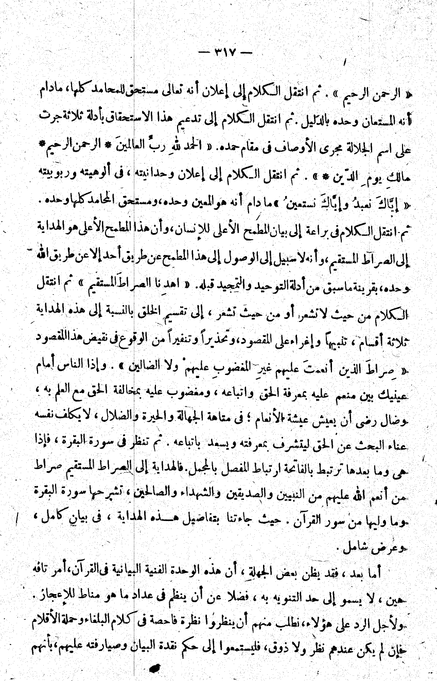 بأنه {الرَّحْمَنِ الرَّحِيمِ} ثم انتقل الكلام إلى إعلان أنه تعالى مستحق للمحامد كلها ما دام أنه المستعان وحده بالدليل ثم انتقل الكلام إلى تدعيم هذا الاستحقاق بأدلة ثلاثة جرت على اسم الجلالة مجرى الأوصاف في مقام حمده {الْحَمْدُ لِلَّهِ رَبِّ الْعَالَمِينَ الرَّحْمَنِ الرَّحِيمِ مَالِكِ يَوْمِ الدِّينِ} ثم انتقل الكلام إلى إعلان وحدانيته في ألوهيته وربوبيته {إِيَّاكَ نَعْبُدُ وَإِيَّاكَ نَسْتَعِينُ} ما دام أنه هو المعين وحده ومستحق المحامد كلها وحده ثم انتقل الكلام في براعة إلى بيان المطمح الأعلى للإنسان وأن هذا المطمح الأعلى هو الهداية إلى الصراط المستقيم وأنه لا سبيل إلى الوصول إلى هذا المطمح عن طريق أحد إلا عن طريق الله وحده بقرينة ما سبق من أدلة التوحيد والتمجيد قبله {اهْدِنَا الصِّرَاطَ الْمُسْتَقِيمَ} ثم انتقل الكلام من حيث لا تشعر أو من حيث تشعر إلى تقسيم الخلق بالنسبة إلى هذه الهداية ثلاثة أقسام تنبيها وإغراء على المقصود وتحذيرا وتنفيرا من الوقوع في نقيض هذا المقصود {صِرَاطَ الَّذِينَ أَنْعَمْتَ عَلَيْهِمْ غَيْرِ الْمَغْضُوبِ عَلَيْهِمْ وَلا الضَّالِّينَ} وإذا الناس أمام عينيك بين منعم عليه بمعرفة الحق واتباعه ومغضوب عليه بمخالفة الحق مع العلم به وضال رضي أن يعيش عيشة الأنعام في متاهة الجهالة والحيرة والضلال لا يكلف نفسه عناء البحث عن الحق ليتشرف بمعرفته ويسعد باتباعه ثم تنظر في سورة البقرة فإذا هي وما بعدها ترتبط بالفاتحة ارتباط المفصل بالمجمل فالهداية إلى الصراط المستقيم صراط من أنعم الله عليهم من النبيين والصديقين والشهداء والصالحين تشرحها سور البقرة وما وليها من سورة القرآن حيث جاءتنا بتفاصيل هذه الهداية في بيان كامل وعرض شامل.
