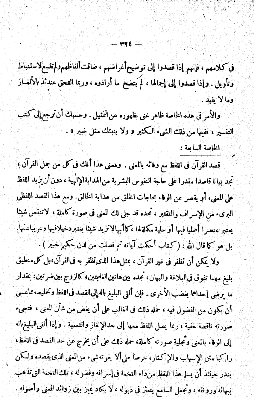 قصد القرآن في اللفظ مع وفائه بالمعنى ومعنى هذا إنك في كل من جمل القرآن تجد بيانا قاصدا مقدرا على حاجة النفوس البشرية من الهداية الإلهية دون أن يزيد اللفظ على المعنى أو يقصر عن الوفاء بحاجات الخلق من هداية الخالق ومع هذا القصد اللفظي البريء من الإسراف والتقتير تجده قد جلى لك المعنى في صورة كاملة لا تنقص شيئا يعتبر عنصرا أصليا فيها أو حلية مكملة لها كما أنها لا تزيد شيئا يعتبر دخيلا فيها وغريبا عنها بل هو كما قال الله: {كِتَابٌ أُحْكِمَتْ آيَاتُهُ ثُمَّ فُصِّلَتْ مِنْ لَدُنْ حَكِيمٍ خَبِيرٍ} .