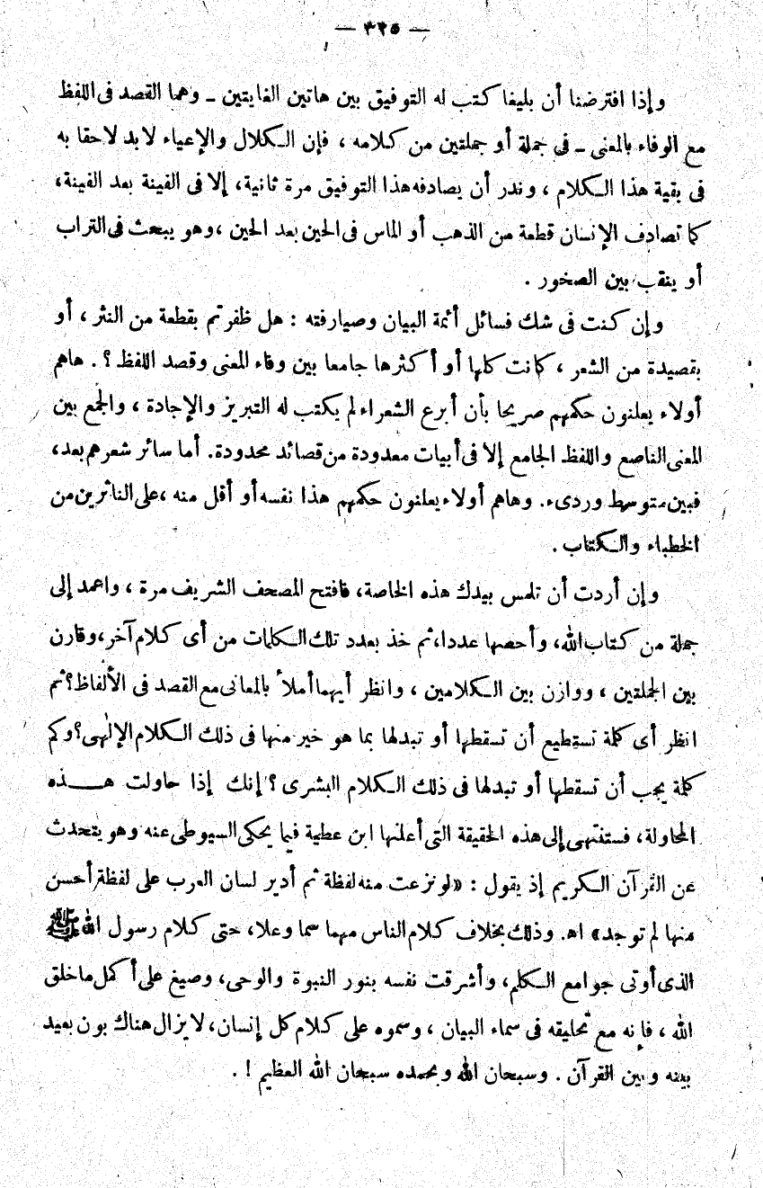 وإذا افترضنا أن بليغا كتب له التوفيق بين هاتين الغايتين وهما القصد في اللفظ مع الوفاء بالمعنى في جملة أو جملتين من كلامه فإن الكلال والإعياء لا بد لاحقا به في بقية هذا الكلام وندر أن يصادفه هذا التوفيق مرة ثانية إلا في الفينة بعد الفينة كما تصادف الإنسان قطعة من الذهب أو الماس في الحين بعد الحين وهو يبحث في التراب أو ينقب بين الصخور.