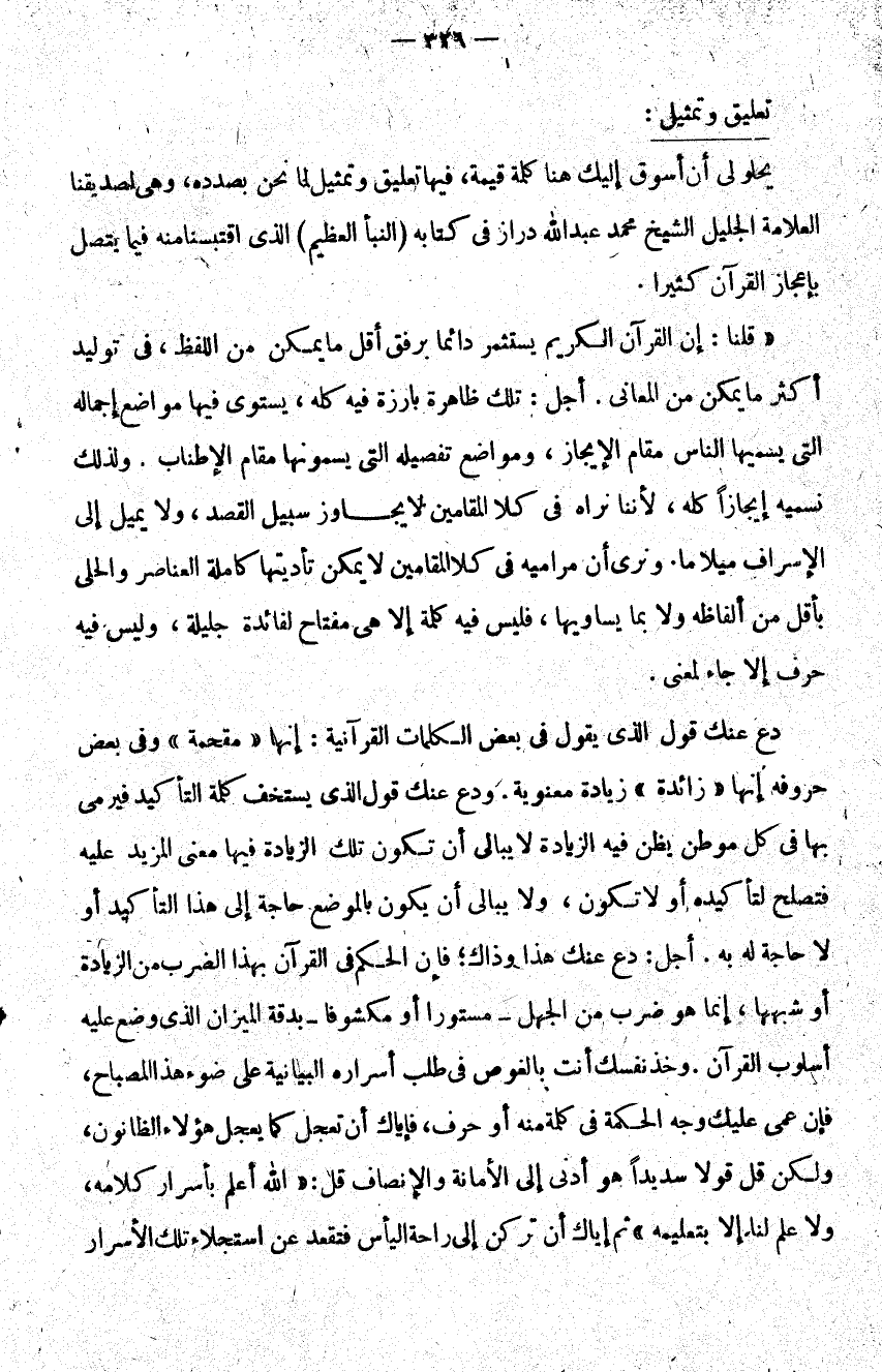 يحلو لي أن أسوق إليك هنا كلمة قيمة فيها تعليق وتمثيل لما نحن بصدده وهي لصديقنا العلامة الجليل الشيخ محمد عبد الله دارز في كتابه النبأ العظيم الذي اقتبسنا منه فيما يتصل بإعجاز القرآن كثيرا.