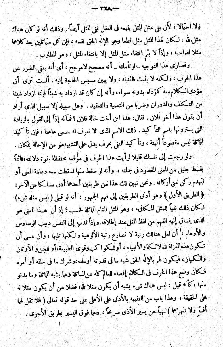 ولو رجعت إلى نفسك قليلا لرأيت هذا الحرف في موقعه محتفظا بقوة دلالته قائما بقسط جليل من المعنى المقصود في جملته وأنه لو سقط منها لسقطت معه دعامة المعنى أو لتهدم ركن من أركانه ونحن نبين لك هذا من طريقين أحدهما أدق مسلكا من الآخر الطريق الأول وهو أدنى الطريقين إلى فهم الجمهور أنه لو قيل ليس مثله شيء لكان ذلك نفيا للمثل المكافئ وهو المثل التام المماثلة فحسب إذ إن هذا المعنى هو الذي ينساق إليه الفهم من لفظ المثل عند إطلاقه وإذا لدب إلى النفس دبيب الوساوس والأوهام أن لعل هنالك رتبة لا تضارع رتبة الألوهية ولكنها تليها وأن عسى أن تكون هذه المنزلة للملائكة والأنبياء أو للكواكب وقوى الطبيعة أو للجن والأوثان والكهان فيكون لهم بالإله الحق شبه ما في قدرته أو علمه وشرك ما في خلقه أو أمره فكان وضع هذا الحرف في الكلام إقصاء للعالم كله عن المماثلة وعما يشبه المماثلة وما يدنو منها كأنه قيل ليس هناك شيء يشبه أن يكون مثلا لله فضلا عن أن يكون مثلا له على الحقيقة وهذا باب من التنبيه بالأدنى على الأعلى على حد قوله تعالى: {فَلا تَقُلْ لَهُمَا أُفٍّ وَلا تَنْهَرْهُمَا} نهيا عن يسير الأذى صريحا وعما فوق اليسير بطريق الأحرى.