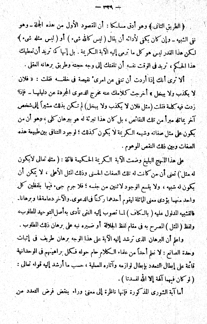 الطريق الثاني وهو أدق مسلكا أن المقصود الأول من هذه الجملة وهو نفي الشبيه وإن كان يكفي لأدائه أن يقال ليس كالله شيء أو ليس كمثله شيء لكن هذا القدر ليس هو كل ما ترمي إليه الآية الكريمة بل إنها كما تريد أن تعطيك هذا الحكم تريد في الوقت نفسه أن تلفتك إلى وجه حجتك وطريق برهانه العقلي.