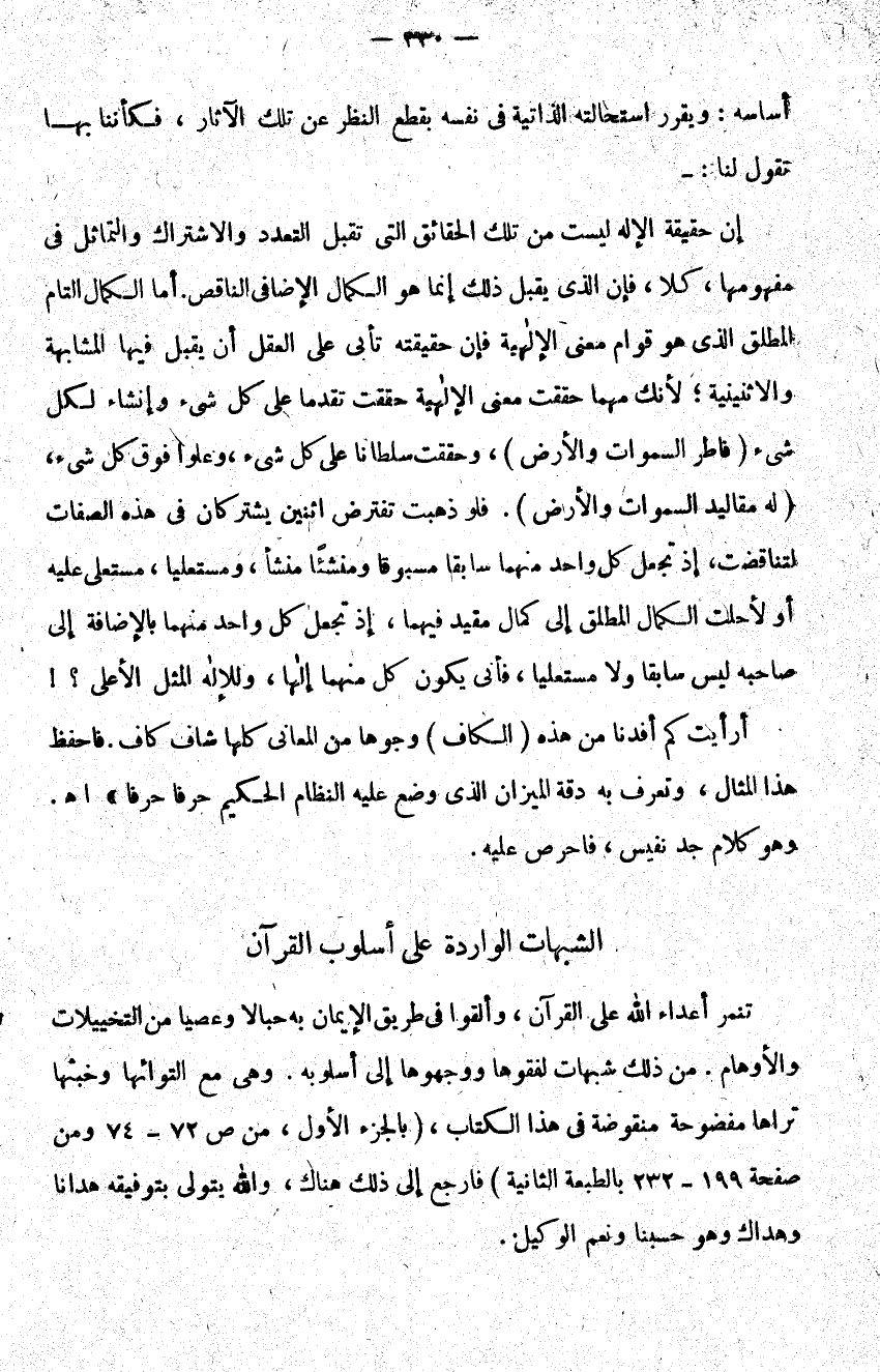تنمر أعداء الله على القرآن وألقوا في طريق الإيمان به حبالا وعصيا من التخييلات والأوهام من ذلك شبهات لفقوها ووجهوها إلى أسلوبه وهي مع التوائها وخبثها تراها مفضوحة منقوضة في هذا الكتاب "بالجزء الأول، من ص 72 – 74 ومن صفحة 199 – 232 بالطبعة" فارجع إلى ذلك هناك والله يتولى بتوفيقه هدانا وهداك وهو حسبنا ونعم الوكيل.
