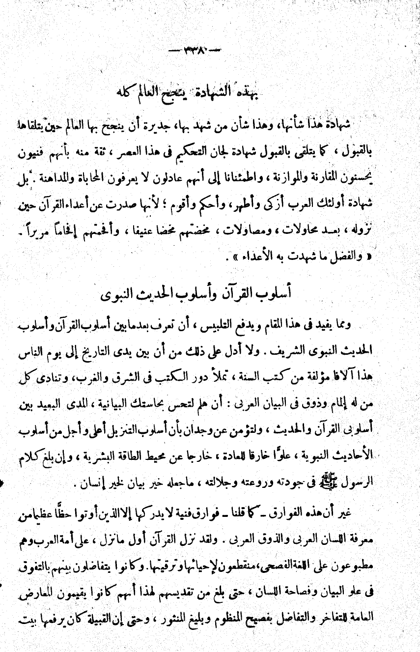 ومما يفيد في هذا المقام ويدفع التلبيس أن تعرف بعد ما بين أسلوب القرآن وأسلوب الحديث النبوي الشريف ولا أدل على ذلك من أن بين يدي التاريخ إلى يوم الناس هذا آلافا مؤلفة من كتب السنة تملأ دون الكتب في الشرق والغرب وتنادي كل من له إلمام وذوق في البيان العربي أن هلم لتحس بحاستك البيانية المدى البعيد بين أسلوبي القرآن والحديث ولتؤمن عن وجدان بأن أسلوب التنزيل أعلى وأجل من أسلوب الأحاديث النبوية علوا خارقا للعادة خارجا عن محيط الطاقة البشرية وإن بلغ كلام الرسول صلى الله عليه وسلم في جودته وروعته وجلالته ما جعله خير بيان لخير إنسان.