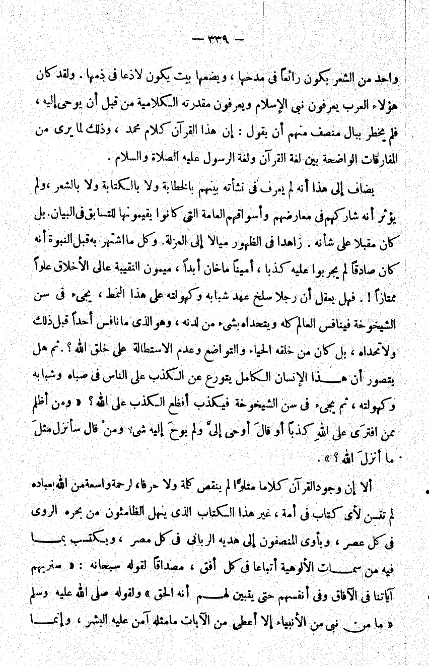 واحد من الشعر يكون رائعا في مدحها ويضعها بيت يكون لاذعا في ذمها ولقد كان هؤلاء العرب يعرفون نبي الإسلام ويعرفون مقدرته الكلامية من قبل أن يوحى إليه فلم يخطر ببال منصف منهم أن يقول إن هذا القرآن كلام محمد وذلك لما يرى من المفارقات الواضحة بين لغة القرآن ولغة الرسول صلى الله عليه وسلم عليه الصلاة والسلام.