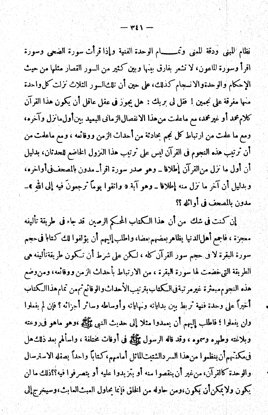 نظام المبنى ودقة المعنى وتمام الوحدة الفنية وإذا قرأت سورة الضحى وسورة اقرأ وسورة الماعون لا تشعر بفارق بينها وبين كثير من السور القصار مثلها من حيث الإحكام والوحدة والانسجام كذلك على حين أن تلك السور الثلاث نزلت كل واحدة منها مفرقة على نجمين فقل لي بربك هل يجوز في عقل عاقل أن يكون هذا القرآن كلام محمد أو غير محمد مع ما علمت من هذا الانفصال الزماني البعيد بين أول ما نزل وآخره ومع ما علمت من ارتباط كل نجم بحادثة من أحداث الزمن ووقائعه ومع ما علمت من أن ترتيب هذه النجوم في القرآن ليس على ترتيب هذا النزول الخاضع للحدثان بدليل أن أول ما نزل من القرآن إطلاقا وهو صدر سورة اقرأ مدون بالمصحف في أواخره وبدليل أن آخر ما نزل منه إطلاقا وهو آية {وَاتَّقُوا يَوْماً تُرْجَعُونَ فِيهِ إِلَى اللَّهِ} مدون بالمصحف في أوائله؟؟