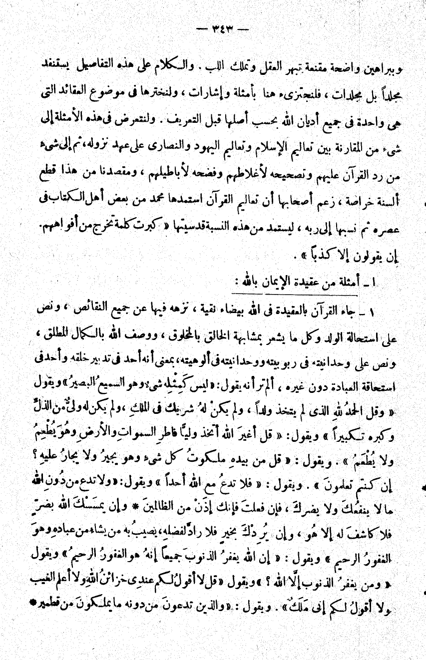 وببراهين واضحة مقنعة تبهر العقل وتملك اللب والكلام على هذه التفاصيل يستنفد مجلدا بل مجلدات فلنجتزئ هنا بأمثلة وإشارات ولنخترها في موضوع العقائد التي هي واحدة في جميع أديان الله بحسب أصلها قبل التعريف ولنتعرض في هذه الأمثلة إلى شيء من المقارنة بين تعاليم الإسلام تعاليم واليهود والنصارى على عهد نزوله ثم إلى شيء من رد القرآن عليهم وتصحيحه لأغلاطهم وفضحه لأباطيلهم ومقصدنا من هذا قطع ألسنة خراصة زعم أصحابها أن تعاليم القرآن استمدها محمد من بعض أهل الكتاب في عصره ثم نسبها إلى ربه ليستمد من هذه النسبة قدسيتها {كَبُرَتْ كَلِمَةً تَخْرُجُ مِنْ أَفْوَاهِهِمْ إِنْ يَقُولُونَ إِلَّا كَذِباً} .