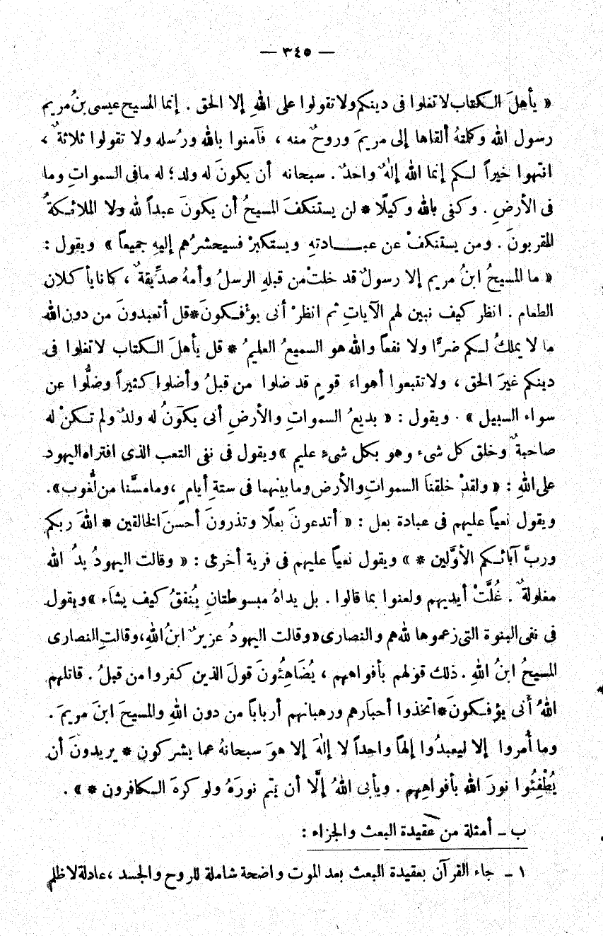 يَا أَهْلَ الْكِتَابِ لا تَغْلُوا فِي دِينِكُمْ وَلا تَقُولُوا عَلَى اللَّهِ إِلَّا الْحَقَّ إِنَّمَا الْمَسِيحُ عِيسَى ابْنُ مَرْيَمَ رَسُولُ اللَّهِ وَكَلِمَتُهُ أَلْقَاهَا إِلَى مَرْيَمَ وَرُوحٌ مِنْهُ فَآمِنُوا بِاللَّهِ وَرُسُلِهِ وَلا تَقُولُوا ثَلاثَةٌ انْتَهُوا خَيْراً لَكُمْ إِنَّمَا اللَّهُ إِلَهٌ وَاحِدٌ سُبْحَانَهُ أَنْ يَكُونَ لَهُ وَلَدٌ لَهُ مَا فِي السَّمَاوَاتِ وَمَا فِي الْأَرْضِ وَكَفَى بِاللَّهِ وَكِيلاً , لَنْ يَسْتَنْكِفَ الْمَسِيحُ أَنْ يَكُونَ عَبْداً لِلَّهِ وَلا الْمَلائِكَةُ الْمُقَرَّبُونَ وَمَنْ يَسْتَنْكِفْ عَنْ عِبَادَتِهِ وَيَسْتَكْبِرْ فَسَيَحْشُرُهُمْ إِلَيْهِ جَمِيعاً} ويقول: {مَا الْمَسِيحُ ابْنُ مَرْيَمَ إِلَّا رَسُولٌ قَدْ خَلَتْ مِنْ قَبْلِهِ الرُّسُلُ وَأُمُّهُ صِدِّيقَةٌ كَانَا يَأْكُلانِ الطَّعَامَ انْظُرْ كَيْفَ نُبَيِّنُ لَهُمُ الْآياتِ ثُمَّ انْظُرْ أَنَّى يُؤْفَكُونَ , قُلْ أَتَعْبُدُونَ مِنْ دُونِ اللَّهِ مَا لا يَمْلِكُ لَكُمْ ضَرّاً وَلا نَفْعاً وَاللَّهُ هُوَ السَّمِيعُ الْعَلِيمُ , قُلْ يَا أَهْلَ الْكِتَابِ لا تَغْلُوا فِي دِينِكُمْ غَيْرَ الْحَقِّ وَلا تَتَّبِعُوا أَهْوَاءَ قَوْمٍ قَدْ ضَلُّوا مِنْ قَبْلُ وَأَضَلُّوا كَثِيراً وَضَلُّوا عَنْ سَوَاءِ السَّبِيلِ} ويقول: {َبدِيعُ السَّمَاوَاتِ وَالْأَرْضِ أَنَّى يَكُونُ لَهُ وَلَدٌ وَلَمْ تَكُنْ لَهُ صَاحِبَةٌ وَخَلَقَ كُلَّ شَيْءٍ وَهُوَ بِكُلِّ شَيْءٍ عَلِيمٌ} ويقول في نفي التعب الذي افتراه اليهود على الله: {وَلَقَدْ خَلَقْنَا السَّمَاوَاتِ وَالْأَرْضَ وَمَا بَيْنَهُمَا فِي سِتَّةِ أَيَّامٍ وَمَا مَسَّنَا مِنْ لُغُوبٍ} ويقول نعيا عليهم في عبادة بعل: {أَتَدْعُونَ بَعْلاً وَتَذَرُونَ أَحْسَنَ الْخَالِقِينَ , اللَّهَ رَبَّكُمْ وَرَبَّ آبَائِكُمُ الْأَوَّلِينَ} ويقول: نعيا عليهم في فرية أخرى: {َقَالَتِ الْيَهُودُ يَدُ اللَّهِ مَغْلُولَةٌ غُلَّتْ أَيْدِيهِمْ وَلُعِنُوا بِمَا قَالُوا بَلْ يَدَاهُ مَبْسُوطَتَانِ يُنْفِقُ كَيْفَ يَشَاءُ} ويقول في نفي البنوة التي زعموها لله هم والنصارى {وَقَالَتِ الْيَهُودُ عُزَيْرٌ ابْنُ اللَّهِ وَقَالَتِ النَّصَارَى الْمَسِيحُ ابْنُ اللَّهِ ذَلِكَ قَوْلُهُمْ بِأَفْوَاهِهِمْ يُضَاهِئُونَ قَوْلَ الَّذِينَ كَفَرُوا مِنْ قَبْلُ قَاتَلَهُمُ اللَّهُ أَنَّى يُؤْفَكُونَ , اتَّخَذُوا أَحْبَارَهُمْ وَرُهْبَانَهُمْ أَرْبَاباً مِنْ دُونِ اللَّهِ وَالْمَسِيحَ ابْنَ مَرْيَمَ وَمَا أُمِرُوا إِلَّا لِيَعْبُدُوا إِلَهاً وَاحِداً لا إِلَهَ إِلَّا هُوَ سُبْحَانَهُ عَمَّا يُشْرِكُونَ , يُرِيدُونَ أَنْ يُطْفِئُوا نُورَ اللَّهِ بِأَفْوَاهِهِمْ وَيَأْبَى اللَّهُ إِلَّا أَنْ يُتِمَّ نُورَهُ وَلَوْ كَرِهَ الْكَافِرُونَ} .