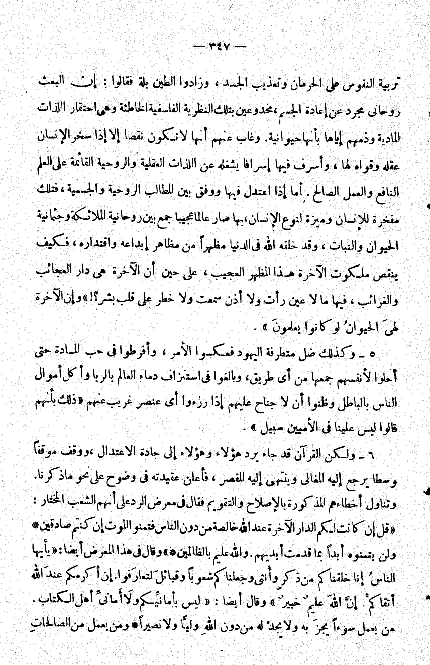 تربية النفوس على الحرمان وتعذيب الجسد وزادوا الطين بلة فقالوا إن البعث روحاني مجرد عن إعادة الجسم مخدوعين بتلك النظرية الفلسفية الخاطئة وهي احتقار اللذات المادية وذمهم إياها بأنها حيوانية وغاب عنهم أنها لا تكون نقصا إلا إذا سخر الإنسان عقله وقواه لها وأسرف فيها إسرافا يشغله عن اللذات العقلية والروحية القائمة على العلم النافع والعمل الصالح أما إذا اعتدل فيها ووفق بين المطالب الروحية والجسمية فتلك مفخرة للإنسان وميزة لنوع الإنسان بها صار عالما عجيبا جمع بين روحانية الملائكة وجثمانية الحيوان والنبات وقد خلقه الله في الدنيا مظهرا من مظاهر إبداعه واقتداره فكيف ينقص ملكوت الآخرة هذا المظهر العجيب على حين أن الآخرة هي دار العجائب والغرائب فيها ما لا عين رأت ولا أذن سمعت ولا خطر على قلب بشر؟! " {وَإِنَّ الدَّارَ الْآخِرَةَ لَهِيَ الْحَيَوَانُ لَوْ كَانُوا يَعْلَمُونَ} .