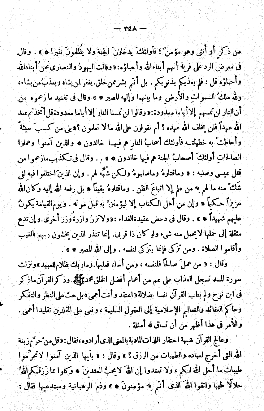 مِنْ ذَكَرٍ أَوْ أُنْثَى وَهُوَ مُؤْمِنٌ فَأُولَئِكَ يَدْخُلُونَ الْجَنَّةَ وَلا يُظْلَمُونَ نَقِيراً} قال في معرض الرد على فرية أنهم أبناء الله وأحباؤه: {وَقَالَتِ الْيَهُودُ وَالنَّصَارَى نَحْنُ أَبْنَاءُ اللَّهِ وَأَحِبَّاؤُهُ قُلْ فَلِمَ يُعَذِّبُكُمْ بِذُنُوبِكُمْ بَلْ أَنْتُمْ بَشَرٌ مِمَّنْ خَلَقَ يَغْفِرُ لِمَنْ يَشَاءُ وَيُعَذِّبُ مَنْ يَشَاءُ وَلِلَّهِ مُلْكُ السَّمَاوَاتِ وَالْأَرْضِ وَمَا بَيْنَهُمَا وَإِلَيْهِ الْمَصِيرُ} وقال في تفنيد ما زعموه من أن النار لن تمسهم إلا أياما معدودة: {وَقَالُوا لَنْ تَمَسَّنَا النَّارُ إِلَّا أَيَّاماً مَعْدُودَةً قُلْ أَتَّخَذْتُمْ عِنْدَ اللَّهِ عَهْداً فَلَنْ يُخْلِفَ اللَّهُ عَهْدَهُ أَمْ تَقُولُونَ عَلَى اللَّهِ مَا لا تَعْلَمُونَ , بَلَى مَنْ كَسَبَ سَيِّئَةً وَأَحَاطَتْ بِهِ خَطِيئَتُهُ فَأُولَئِكَ أَصْحَابُ النَّارِ هُمْ فِيهَا خَالِدُونَ , وَالَّذِينَ آمَنُوا وَعَمِلُوا الصَّالِحَاتِ أُولَئِكَ أَصْحَابُ الْجَنَّةِ هُمْ فِيهَا خَالِدُونَ} وقال في تكذيب ما زعموا من قتل عيسى وصلبه: {وَقَوْلِهِمْ إِنَّا قَتَلْنَا الْمَسِيحَ عِيسَى ابْنَ مَرْيَمَ رَسُولَ اللَّهِ وَمَا قَتَلُوهُ وَمَا صَلَبُوهُ وَلَكِنْ شُبِّهَ لَهُمْ وَإِنَّ الَّذِينَ اخْتَلَفُوا فِيهِ لَفِي شَكٍّ مِنْهُ مَا لَهُمْ بِهِ مِنْ عِلْمٍ إِلَّا اتِّبَاعَ الظَّنِّ وَمَا قَتَلُوهُ يَقِيناً , بَلْ رَفَعَهُ اللَّهُ إِلَيْهِ وَكَانَ اللَّهُ عَزِيزاً حَكِيماً , وَإِنْ مِنْ أَهْلِ الْكِتَابِ إِلَّا لَيُؤْمِنَنَّ بِهِ قَبْلَ مَوْتِهِ وَيَوْمَ الْقِيَامَةِ يَكُونُ عَلَيْهِمْ شَهِيداً} . وقال في دحض عقيدة الفداء: {وَلا تَزِرُ وَازِرَةٌ وِزْرَ أُخْرَى وَإِنْ تَدْعُ مُثْقَلَةٌ إِلَى حِمْلِهَا لا يُحْمَلْ مِنْهُ شَيْءٌ وَلَوْ كَانَ ذَا قُرْبَى إِنَّمَا تُنْذِرُ الَّذِينَ يَخْشَوْنَ رَبَّهُمْ بِالْغَيْبِ وَأَقَامُوا الصَّلاةَ وَمَنْ تَزَكَّى فَإِنَّمَا يَتَزَكَّى لِنَفْسِهِ وَإِلَى اللَّهِ الْمَصِيرُ} .
