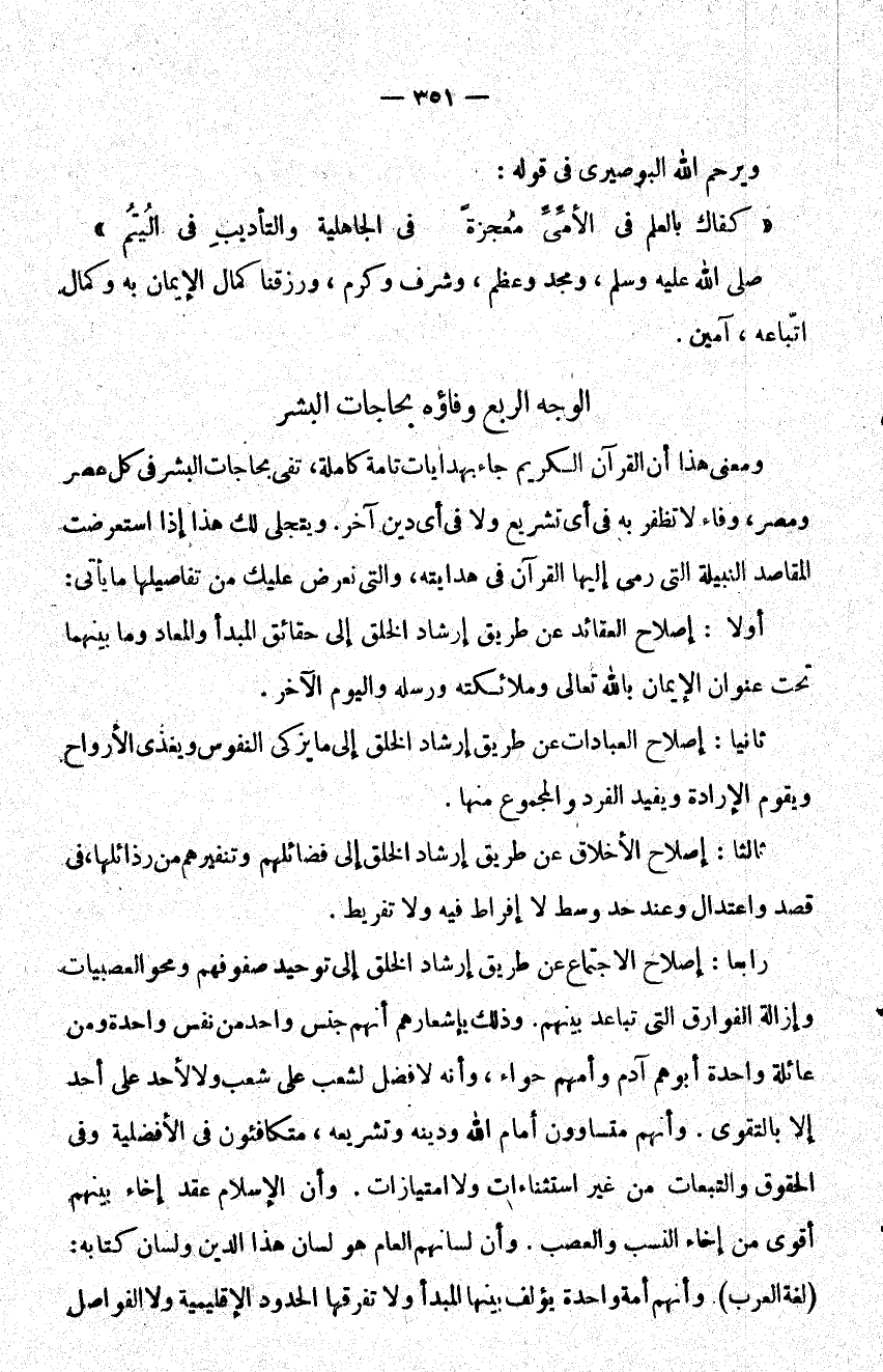 رابعا: إصلاح الاجتماع عن طريق إرشاد الخلق إلى توحيد صفوفهم ومحو العصبيات وإزالة الفوارق التي تباعد بينهم وذلك بإشعارهم أنهم جنس واحد من نفس واحدة ومن عائلة واحدة أبوهم آدم وأمهم حواء وأنه لا فضل لشعب على شعب ولا لأحد على أحد إلا بالتقوى وأنهم متساوون أمام الله ودينه وتشريعه متكافئون في الأفضلية وفي الحقوق والتبعات من غير استثناءات ولا امتيازات وأن الإسلام عقد إخاء بينهم أقوى من إخاء النسب والعصب وأن لسانهم العام هو لسان هذا الدين ولسان كتابه لغة العرب وأنهم أمة واحدة يؤلف بينها المبدأ ولا تفرقها الحدود الإقليمية ولا الفواصل