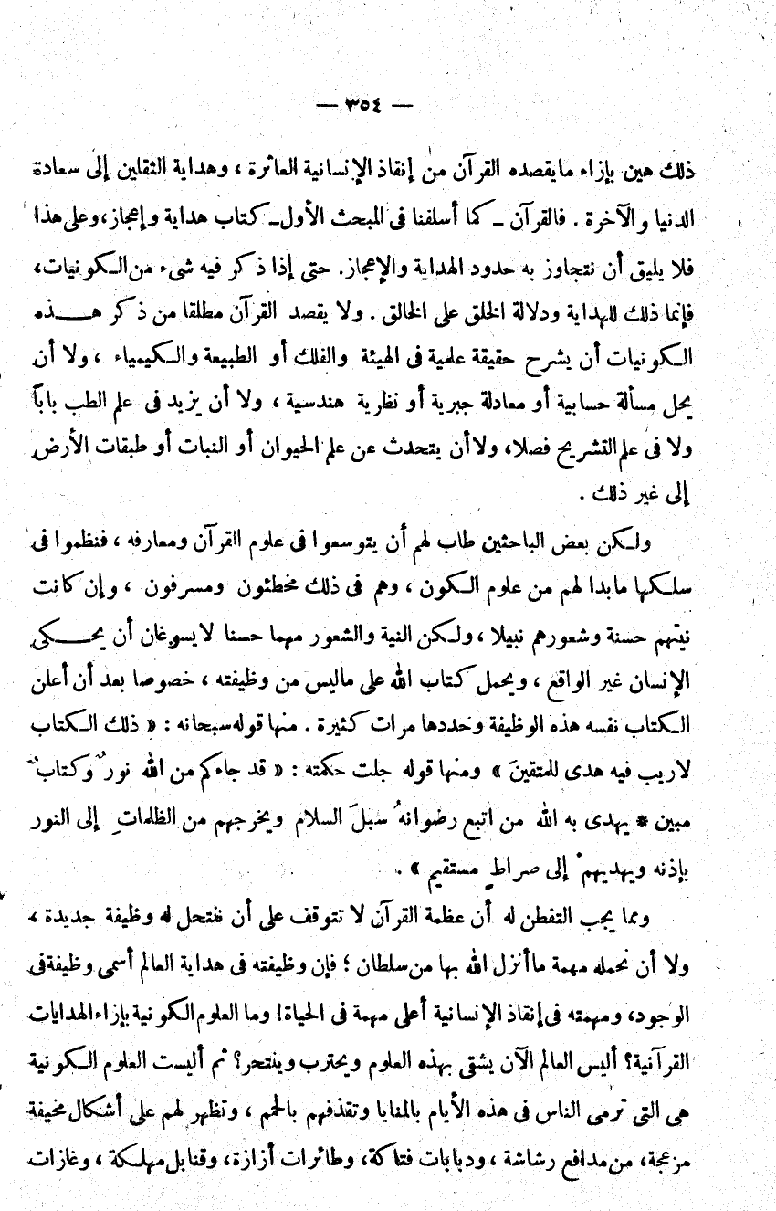 ولكن بعض الباحثين طاب لهم أن يتوسعوا في علوم القرآن ومعارفه فنظموا في سلكها ما بدا لهم من علوم الكون وهم في ذلك مخطئون ومسرفون وإن كانت نيتهم حسنة وشعورهم نبيلا ولكن النية والشعور مهما حسنا لا يسوغان أن يحكي الإنسان غير الواقع ويحمل كتاب الله على ما ليس من وظيفته خصوصا بعد أن أعلن الكتاب نفسه هذه الوظيفة وحددها مرات كثيرة منها قوله سبحانه: {ذَلِكَ الْكِتَابُ لا رَيْبَ فِيهِ هُدىً لِلْمُتَّقِينَ} ومنها قوله جلت حكمته: {قَدْ جَاءَكُمْ مِنَ اللَّهِ نُورٌ وَكِتَابٌ مُبِينٌ , يَهْدِي بِهِ اللَّهُ مَنِ اتَّبَعَ رِضْوَانَهُ سُبُلَ السَّلامِ وَيُخْرِجُهُمْ مِنَ الظُّلُمَاتِ إِلَى النُّورِ بِإِذْنِهِ وَيَهْدِيهِمْ إِلَى صِرَاطٍ مُسْتَقِيمٍ} .