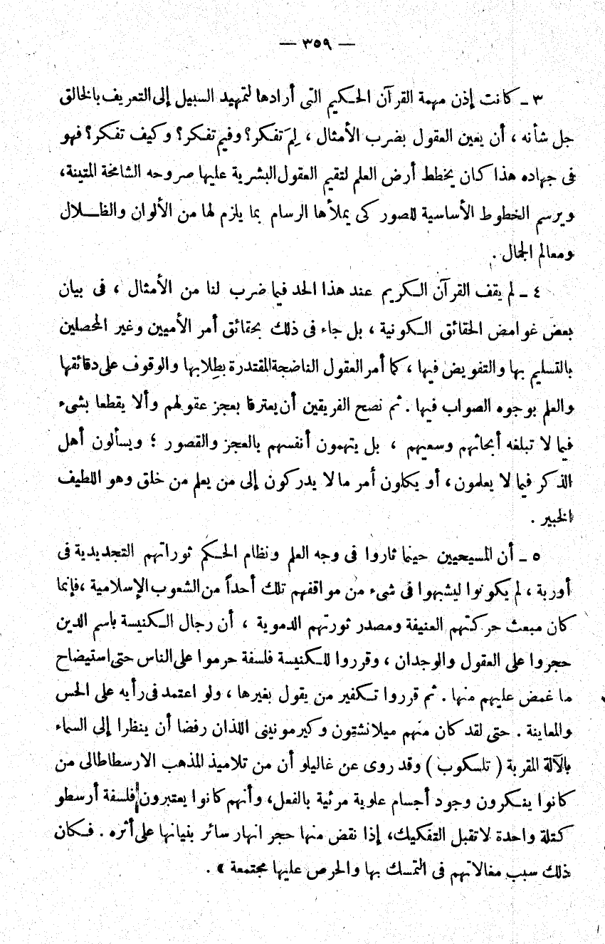 3 - كانت إذن مهمة القرآن الحكيم التي أرادها لتمهيد السبيل إلى التعريف بالخالق جل شأنه أن يعين العقول بضرب الأمثال لم تفكر؟ وفيم تفكر؟ وكيف تفكر؟ فهو في جهاده هذا كان يخطط أرض العلم لتقيم العقول البشرية عليها صروحه الشامخة المتينة ويرسم الخطوط الأساسية للصور كي يملأها الرسام بما يلزم لها من الألوان والظلال ومعالم الجمال.