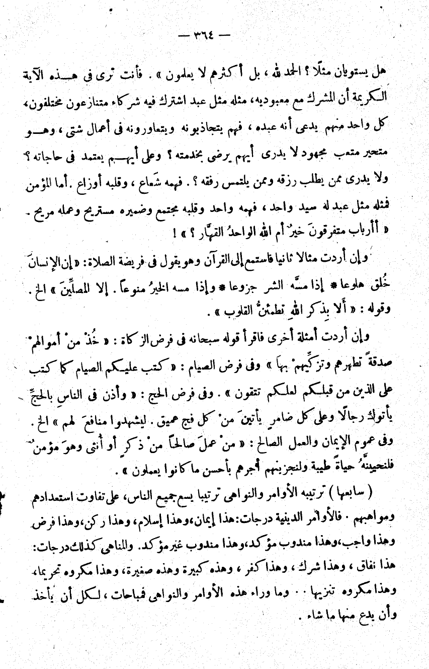 هَلْ يَسْتَوِيَانِ مَثَلاً الْحَمْدُ لِلَّهِ بَلْ أَكْثَرُهُمْ لا يَعْلَمُونَ} فأنت ترى في هذه الآية الكريمة أن المشرك مع معبوديه مثله مثل عبد اشترك فيه شركاء متنازعون مختلفون كل واحد منهم يدعي أيهم عبده فهم يتجاذبونه ويتعاورونه في أعمال شتى وهو متحير متعب مجهود لا يدري أيهم يرضى بخدمته وعلى أيهم يعتمد في حاجاته؟ ولا يدري ممن يطلب رزقه وممن يلتمس رفقه فهمه شعاع وقلبه أوزاع أما المؤمن فمثله مثل عبد له سيد واحد فهمه وقلبه مجتمع وضميره مستريح وعمله مريح {أَأَرْبَابٌ مُتَفَرِّقُونَ خَيْرٌ أَمِ اللَّهُ الْوَاحِدُ الْقَهَّار} !.