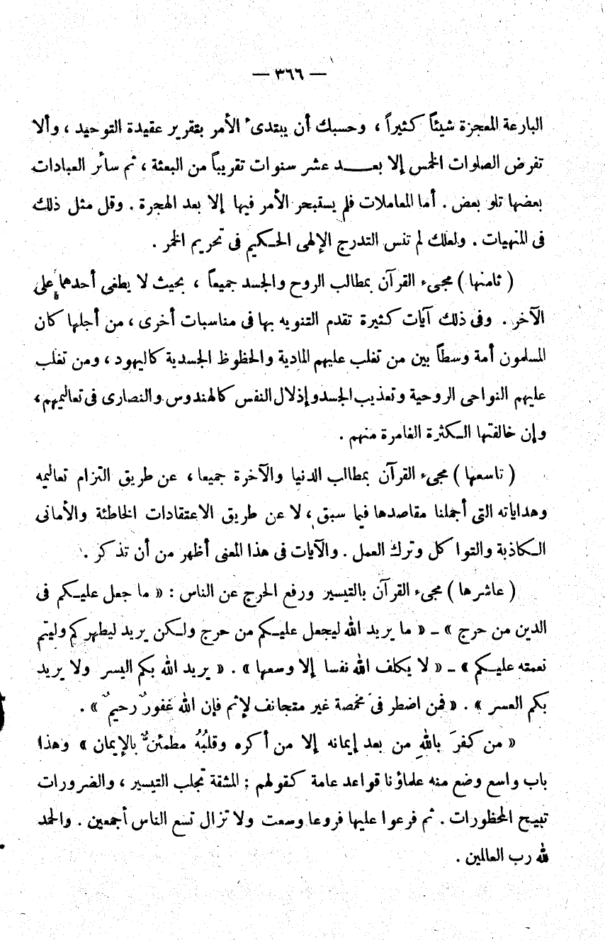 البارعة المعجزة شيئا كثيرا وحسبك ان يبتدئ الأمر بتقرير عقيدة التوحيد وألا تفرض الصلوات الخمس إلا بعد عشر سنوات تقريبا من البعثة ثم سائر العبادات بعضها تلو بعض أما المعاملات فلم يستبحر الأمر فيها إلا بعد الهجرة وقل مثل ذلك في المنهيات ولعلك لم تنس التدرج الإلهي الحكيم في تحريم الخمر.