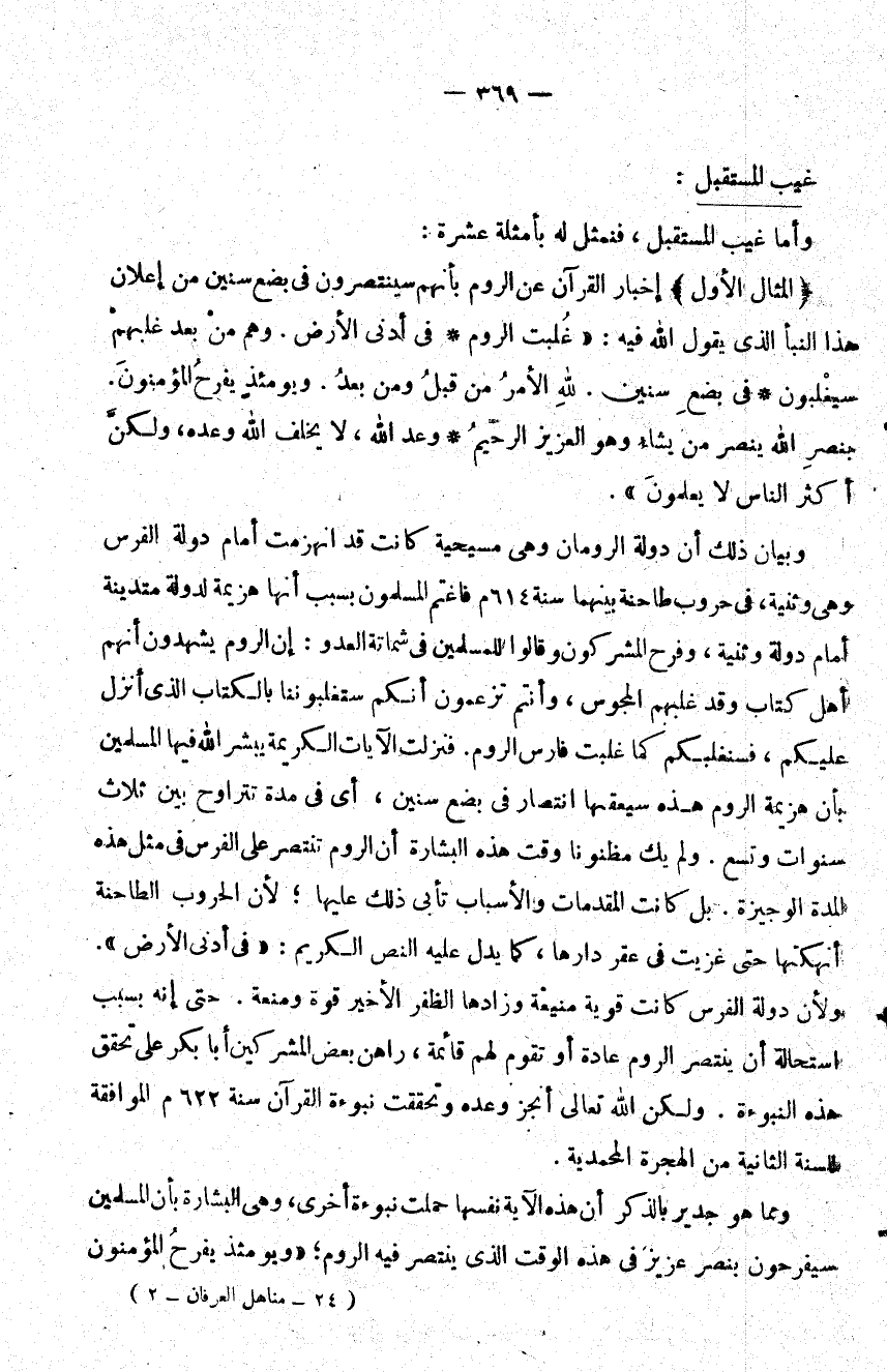وبيان ذلك أن دولة الرومان وهي مسيحية كانت قد انهزمت أمام دولة الفرس وهي وثنية في حروب طاحنة بينهما سنة 614م فاغتم المسلمون بسبب أنها هزيمة لدولة متدينة أمام دولة وثنية وفرح المشركون وقالوا للمسلمين في شماتة العدو إن الروم يشهدون أنهم أهل كتاب وقد غلبهم المجوس وأنتم تزعمون أنكم ستغلبون بالكتاب الذي أنزل عليكم فسنغلبكم كما غلبت فارس الروم فنزلت الآيات الكريمة يبشر الله فيها المسلمين بأن هزيمة الروم هذه سيعقبها انتصار في بضع سنين أي في مدة تتراوح بين ثلاثة سنوات وتسع ولم يك مظنونا وقت هذه البشارة أن الروم تنتصر على الفرس في مثل هذه المدة الوجيزة بل كانت المقدمات والأسباب تأبى ذلك عليها لأن الحروب الطاحنة أنهكتها حتى غزيت في عقر دارها كما يدل عليه النص الكريم {فِي أَدْنَى الْأَرْضِ} ولأن دولة الفرس كانت قوية منيعة وزادها الظفر الأخير قوة ومنعة حتى إنه بسبب استحالة أن ينتصر الروم عادة أو تقوم لهم قائمة راهن بعض المشركين أبا بكر على تحقق هذه النبوءة ولكن الله تعالى أنجز وعده وتحققت نبوءة القرآن سنة 622 م الموافقة للسنة الثانية من الهجرة المحمدية.