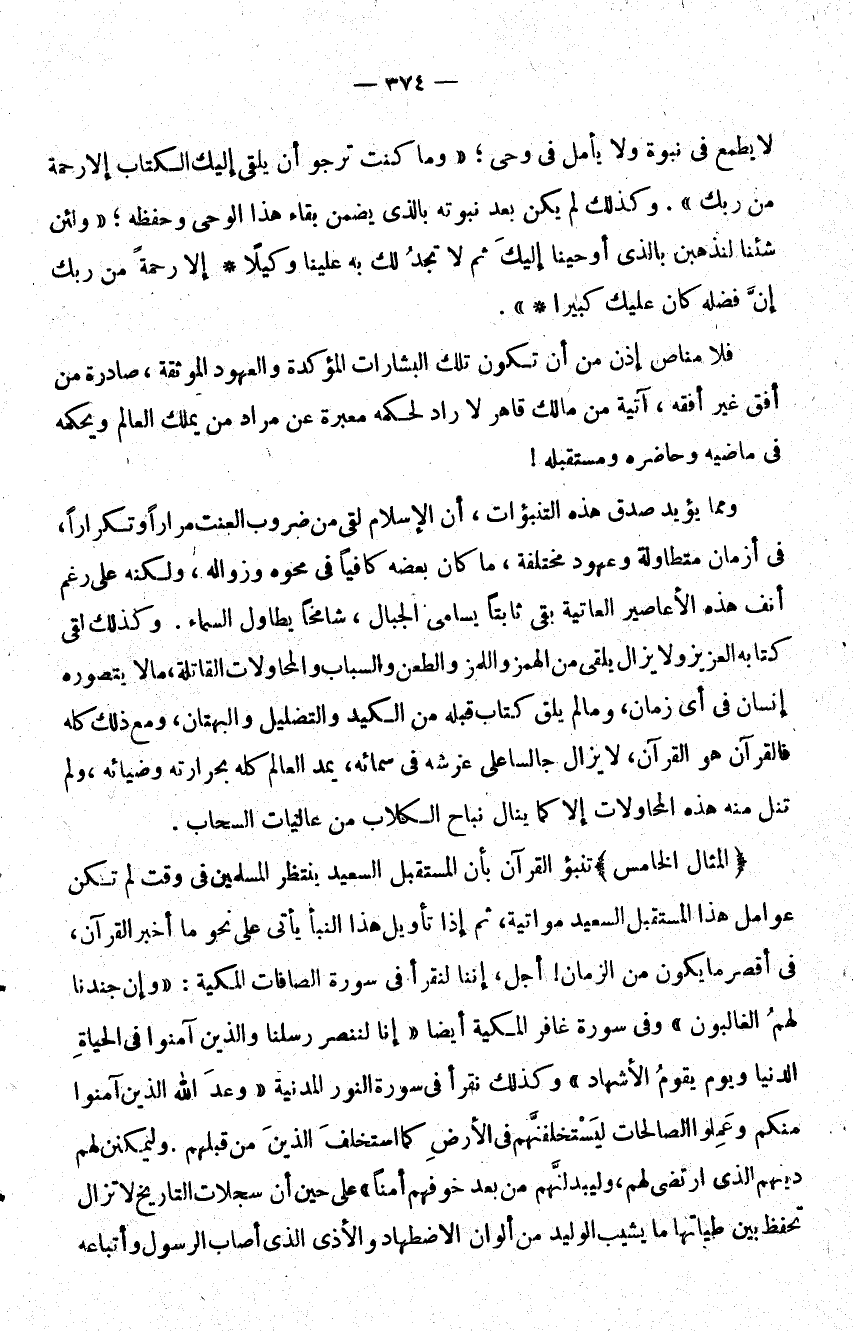 المثال الخامس تنبؤ القرآن بأن المستقبل السعيد يتنظر المسلمين في وقت لم تكن عوامل هذا المستقبل السعيد مواتية ثم إذا تأويل هذا النبأ يأتي على نحو ما أخبر القرآن في أقصر ما يكون من الزمان أجل إننا لنقرأ في سورة الصافات المكية: {وَإِنَّ جُنْدَنَا لَهُمُ الْغَالِبُونَ} وفي سورة غافر المكية أيضا: {إِنَّا لَنَنْصُرُ رُسُلَنَا وَالَّذِينَ آمَنُوا فِي الْحَيَاةِ الدُّنْيَا وَيَوْمَ يَقُومُ الْأَشْهَادُ} وكذلك نقرأ في سورة النور المدنية {وَعَدَ اللَّهُ الَّذِينَ آمَنُوا مِنْكُمْ وَعَمِلُوا الصَّالِحَاتِ لَيَسْتَخْلِفَنَّهُمْ فِي الْأَرْضِ كَمَا اسْتَخْلَفَ الَّذِينَ مِنْ قَبْلِهِمْ وَلَيُمَكِّنَنَّ لَهُمْ دِينَهُمُ الَّذِي ارْتَضَى لَهُمْ وَلَيُبَدِّلَنَّهُمْ مِنْ بَعْدِ خَوْفِهِمْ أَمْناً} على حين أن سجلات التاريخ لا تزال تحفظ بين طياتها ما يشيب الوليد من ألوان الاضطهاد والأذى الذي أصاب الرسول وأتباعه