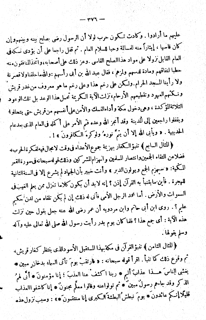 المثال الثامن تنبؤ القرآن في مكة بهذا المستقبل الأسود الذي ينتظر كفار قريش ثم وقوع ذلك كما تنبأ اقرأ قوله سبحانه: {فَارْتَقِبْ يَوْمَ تَأْتِي السَّمَاءُ بِدُخَانٍ مُبِينٍ , يَغْشَى النَّاسَ هَذَا عَذَابٌ أَلِيمٌ , رَبَّنَا اكْشِفْ عَنَّا الْعَذَابَ إِنَّا مُؤْمِنُونَ , أَنَّى لَهُمُ الذِّكْرَى وَقَدْ جَاءَهُمْ رَسُولٌ مُبِينٌ , ثُمَّ تَوَلَّوْا عَنْهُ وَقَالُوا مُعَلَّمٌ مَجْنُونٌ , إِنَّا كَاشِفُو الْعَذَابِ قَلِيلاً إِنَّكُمْ عَائِدُونَ , يَوْمَ نَبْطِشُ الْبَطْشَةَ الْكُبْرَى إِنَّا مُنْتَقِمُونَ , وسبب نزول هذه