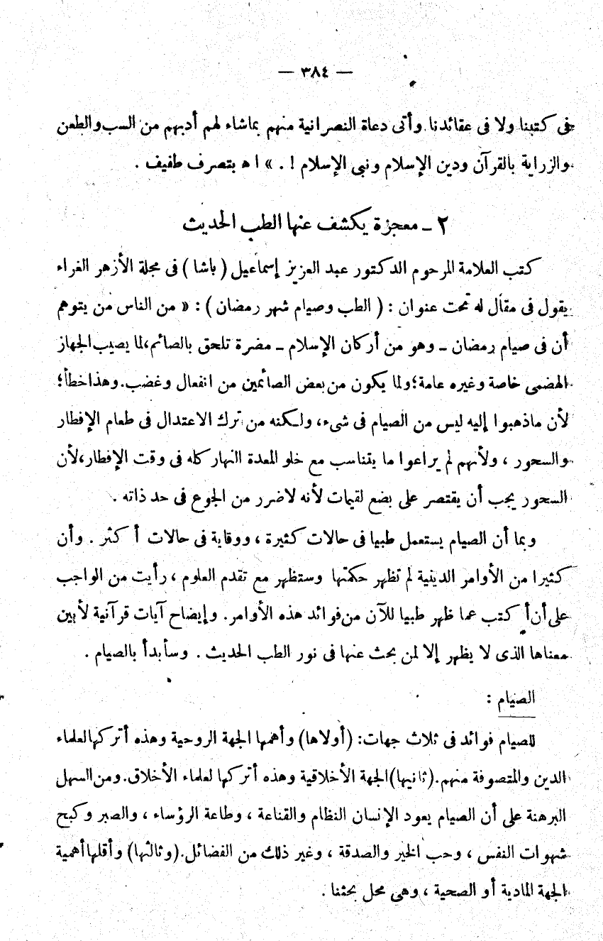 كتب العلامة المرحوم الدكتور عبد العزيز إسماعيل باشا في مجلة الأزهر الغراء يقول في مقال له تحت عنوان الطب وصيام شهر رمضان من الناس من يتوهم أن في صيام رمضان وهو من أركان الإسلام مضرة تلحق بالصائم لما يصيب الجهاز الهضمي خاصة وغيره عامة ولما يكون من بعض الصائمين من انفعال وغضب وهذا خطأ لأن ما ذهبوا إليه ليس من الصيام في شيء ولكنه من ترك الاعتدال في طعام الإفطار والسحور ولأنهم لم يراعوا ما يتناسب مع خلو المعدة النهار كله في وقت الإفطار لأن السحور يجب أن يقتصر على بضع لقيمات لأنه لا ضرر من الجوع في حد ذاته وبما أن الصيام يستعمل طبيا في حالات كثيرة ووقاية في حالات أكثر وأن كثيرا من الأوامر الدينية لم تظهر حكمتها وستظهر مع تقدم العلوم رأيت من الواجب على أن أكتب عما ظهر طبيا للآن من فوائده هذه الأوامر وإيضاح آيات قرآنية لأبين معناها الذي لا يظهر إلا لمن بحث عنها في نور الطب الحديث وسأبدأ بالصيام.