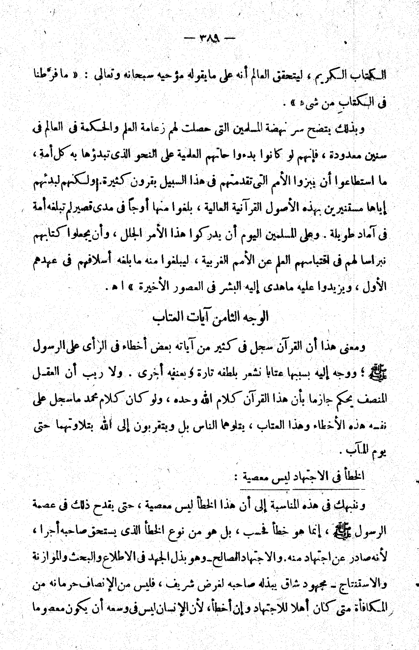 ومعنى هذا أن القرآن سجل في كثير من آياته بعض أخطاء في الرأي على الرسول صلى الله عليه وسلم ووجه إليه بسببها عتابا نشعر بلطفه تارة وبعنفه أخرى ولا ريب أن العقل المنصف يحكم جازما بأن هذا القرآن كلام الله وحده ولو كان كلام محمد ما سجل على نفسه هذه الأخطاء وهذا العتاب يتلوهما الناس بل ويتقربون إلى الله بتلاوتهما حتى يوم المآب.