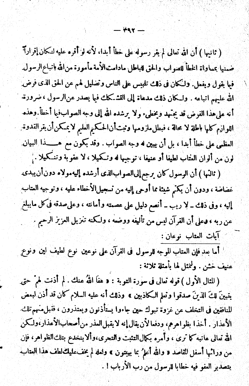 ثانيها أن الله تعالى لم يقر رسوله على خطأ أبدا لأنه لو أقره عليه لكان إقرارا ضمنيا بمساواة الخطأ للصواب والحق للباطل ما دامت الأمة مأمورة من الله باتباع الرسول صلى الله عليه وسلم فيما يقول ويفعل ولكان في ذلك تلبيس على الناس وتضليل لهم عن الحق الذي فرض الله عليهم اتباعه ولكان ذلك مدعاة إلى التشكك فيما يصدر عن الرسول صلى الله عليه وسلم ضرورة أنه على هذا الفرض قد يجتهد ويخطئ ولا يرشده الله إلى وجه الصواب فيما أخطأ وهذه اللوازم كلها باطلة لا محالة فبطل ملزومها وثبت أن الحكيم العليم لا يمكن أن يقر القدوة العظمى على خطأ أبدا بل يبين له وجه الصواب وقد يكون مع هذا البيان لون من ألوان العتاب لطيفا أو عنيفا توجيها له وتكليما لا عقوبة وتنكيلا.