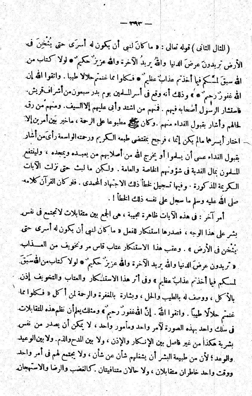 أمر آخر في هذه الآيات ظاهرة عجيبة هي الجمع بين متقابلات لا تجتمع في نفس بشر على هذا الوجه فصدرها استنكار للفعل ما كان لنبي أن يكون له أسرى حتى يثخن وعقب هذا الاستنكار عتاب قاس مر وتخويف من العذاب تريدون عرض الدنيا والله يريد الآخرة والله عزيز حكيم لولا كتاب من الله سبق لمسكم فيما أخذتم عذاب عظيم وفي أثر هذا الاستنكار والعتاب والتخويف إذن بالأكل ووصف له بالطيب والحل وبشارة بالمغفرة والرحمة لمن أكل فكلوا مما غنمتم حلالا طيبا واتقوا الله إن الله غفور رحيم ومثلك يعلم أن نظم هذه المتقابلات في سلك واحد بهذه الصورة لآمر واحد ومأمور واحد لا يمكن أن يصدر من نفس بشرية هكذا من غير فاصل بين الإنكار والإذن ولا بين المدح والذم ولا بين الوعيد والوعد لأن من طبيعة البشر أن يشغلهم شأن عن شأن ولا يجتمع لهم في أمر واحد ووقت واحد خاطران متقابلان ولا حالان متنافيان كالغضب والرضا والإستهجان