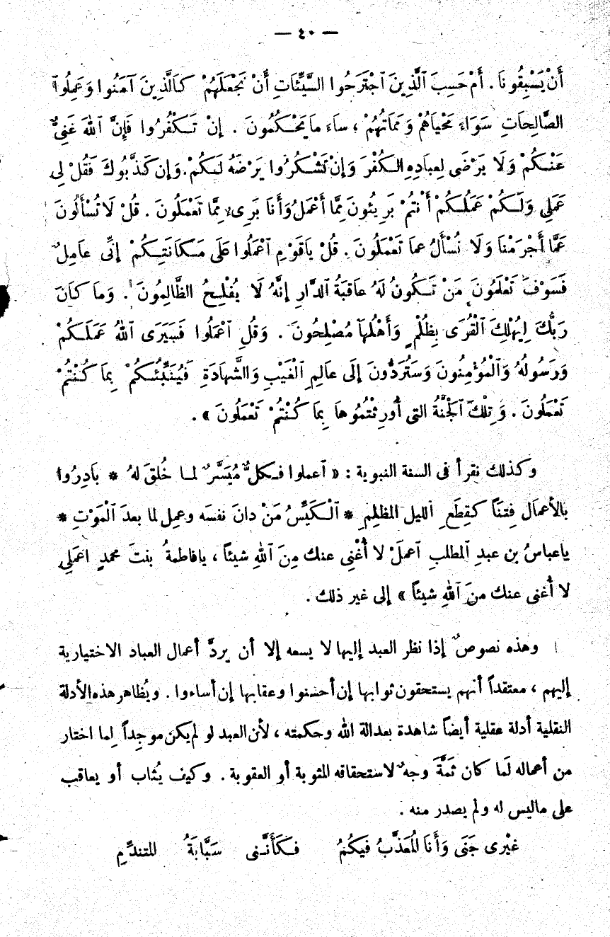 أَنْ يَسْبِقُونَا أَمْ حَسِبَ الَّذِينَ اجْتَرَحُوا السَّيِّئَاتِ أَنْ نَجْعَلَهُمْ كَالَّذِينَ آمَنُوا وَعَمِلُوا الصَّالِحَاتِ سَوَاءً مَحْيَاهُمْ وَمَمَاتُهُمْ سَاءَ مَا يَحْكُمُونَ إِنْ تَكْفُرُوا فَإِنَّ اللَّهَ غَنِيٌّ عَنْكُمْ وَلا يَرْضَى لِعِبَادِهِ الْكُفْرَ وَإِنْ تَشْكُرُوا يَرْضَهُ لَكُمْ وَإِنْ كَذَّبُوكَ فَقُلْ لِي عَمَلِي وَلَكُمْ عَمَلُكُمْ أَنْتُمْ بَرِيئُونَ مِمَّا أَعْمَلُ وَأَنَا بَرِيءٌ مِمَّا تَعْمَلُونَ ُلْ لا تُسْأَلونَ عَمَّا أَجْرَمْنَا وَلا نُسْأَلُ عَمَّا تَعْمَلُونَ قُلْ يَا قَوْمِ اعْمَلُوا عَلَى مَكَانَتِكُمْ إِنِّي عَامِلٌ فَسَوْفَ تَعْلَمُونَ مَنْ تَكُونُ لَهُ عَاقِبَةُ الدَّارِ إِنَّهُ لا يُفْلِحُ الظَّالِمُونَ وَمَا كَانَ رَبُّكَ لِيُهْلِكَ الْقُرَى بِظُلْمٍ وَأَهْلُهَا مُصْلِحُونَ وَقُلِ اعْمَلُوا فَسَيَرَى اللَّهُ عَمَلَكُمْ وَرَسُولُهُ وَالْمُؤْمِنُونَ وَسَتُرَدُّونَ إِلَى عَالِمِ الْغَيْبِ وَالشَّهَادَةِ فَيُنَبِّئُكُمْ بِمَا كُنْتُمْ تَعْمَلُونَ وَتِلْكَ الْجَنَّةُ الَّتِي أُورِثْتُمُوهَا بِمَا كُنْتُمْ تَعْمَلُونَ} .