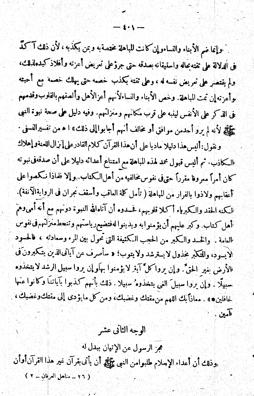 ونقول: أليس هذا دليلا ماديا على أن القرآن كلام القادر على إنزال اللعنة وإهلاك الكاذب ثم أليس قبول محمد لهذه المبالهة مع امتناع أعدائه دليلا على أن صدقه في نبوته كان أمرا معروفا مقررا حتى في نفوس مخالفيه من أهل الكتاب وإلا فلماذا نكصوا على أعقابهم ولاذوا بالفرار من المباهلة تأمل كلمة العاقب وأسقف نجران في الرواية الآنفة لكنه الحقد والكبرياء أكلا قلوبهم فحسدوه أن آتاه الله النبوة دونهم مع أنه أمي وهم أهل كتاب وكبر عليهم أن يؤمنوا به ويدينوا له فتضيع رياستهم وتنحط منزلتهم في نفوس العامة والحسد والكبر من الحجب الكثيفة التي تحول بين المرء وسعادته فالحسود لا يسود والمتكبر مخذول لا يسترشد ولا يتوب؛ {سَأَصْرِفُ عَنْ آيَاتِيَ الَّذِينَ يَتَكَبَّرُونَ فِي الْأَرْضِ بِغَيْرِ الْحَقِّ وَإِنْ يَرَوْا كُلَّ آيَةٍ لا يُؤْمِنُوا بِهَا وَإِنْ يَرَوْا سَبِيلَ الرُّشْدِ لا يَتَّخِذُوهُ سَبِيلاً وَإِنْ يَرَوْا سَبِيلَ الْغَيِّ يَتَّخِذُوهُ سَبِيلاً ذَلِكَ بِأَنَّهُمْ كَذَّبُوا بِآياتِنَا وَكَانُوا عَنْهَا غَافِلِينَ} معاذا بك اللهم من مقتك وغضبك ومن كل ما يؤدي إلى مقتك وغضبك آمين.