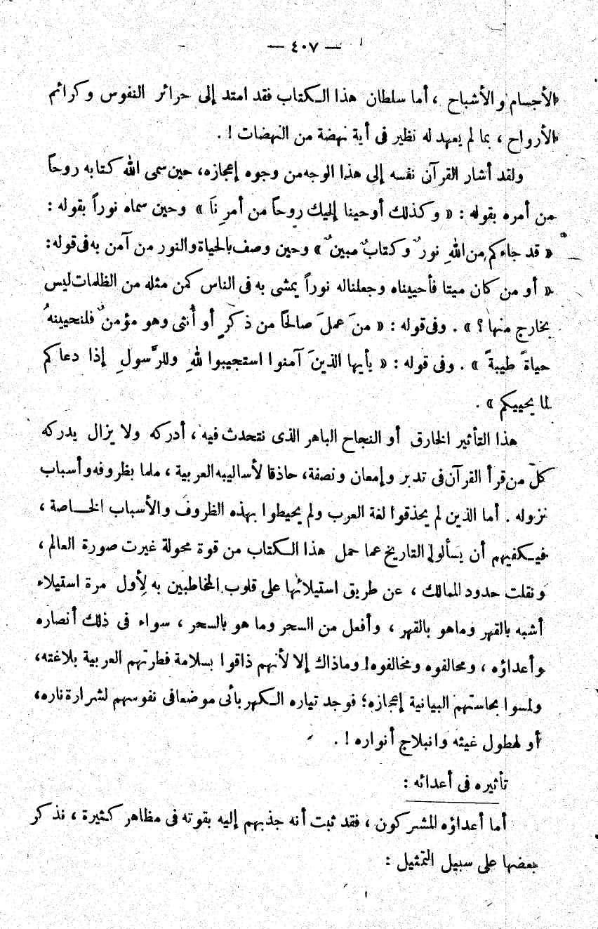 ولقد أشار القرآن نفسه إلى هذه الوجه من وجوه إعجازه حين سمى الله كتابه روحا من أمره بقوله {وَكَذَلِكَ أَوْحَيْنَا إِلَيْكَ رُوحاً مِنْ أَمْرِنَا} وحين سماه نورا بقوله: {قَدْ جَاءَكُمْ مِنَ اللَّهِ نُورٌ وَكِتَابٌ مُبِينٌ} وحين وصف بالحياة والنور من آمن به في قوله: {أَوَمَنْ كَانَ مَيْتاً فَأَحْيَيْنَاهُ وَجَعَلْنَا لَهُ نُوراً يَمْشِي بِهِ فِي النَّاسِ كَمَنْ مَثَلُهُ فِي الظُّلُمَاتِ لَيْسَ بِخَارِجٍ مِنْهَا} وفي قوله: {مَنْ عَمِلَ صَالِحاً مِنْ ذَكَرٍ أَوْ أُنْثَى وَهُوَ مُؤْمِنٌ فَلَنُحْيِيَنَّهُ حَيَاةً طَيِّبَةً} وفي قوله: {يَا أَيُّهَا الَّذِينَ آمَنُوا اسْتَجِيبُوا لِلَّهِ وَلِلرَّسُولِ إِذَا دَعَاكُمْ لِمَا يُحْيِيكُمْ} .